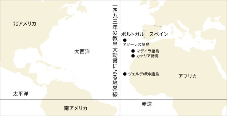 ポルトガルはアフリカ大陸の西海岸を南下する形で進出していったので、ローマ教皇による承認は、当初、新たに土地が発見されるたびに地図上の緯線を基準にして更新されていました。ところが、1492年にスペインの援助によってコロンブスが新大陸を発見すると、一転して経線による分割承認が必要となってきます。
