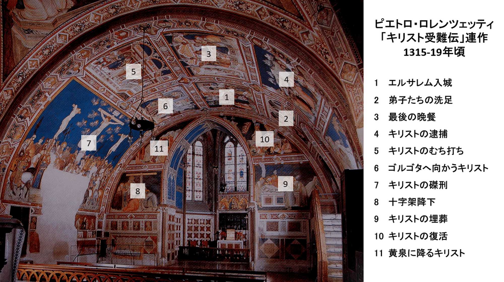 ジョットに始まる革新的な表現を単に継承するだけでなく、そこに独自の要素を加えて自身の様式を確立させたのがピエトロ・ロレンツェッティです。彼の代表作であるアッシジのサン・フランチェスコ聖堂に描かれた「キリスト受難伝」連作[図1]のうち、前回は《エルサレム入城》の場面を、中世やジョットの同主題作品と比較して、この画家の特徴を浮き彫りにしました。