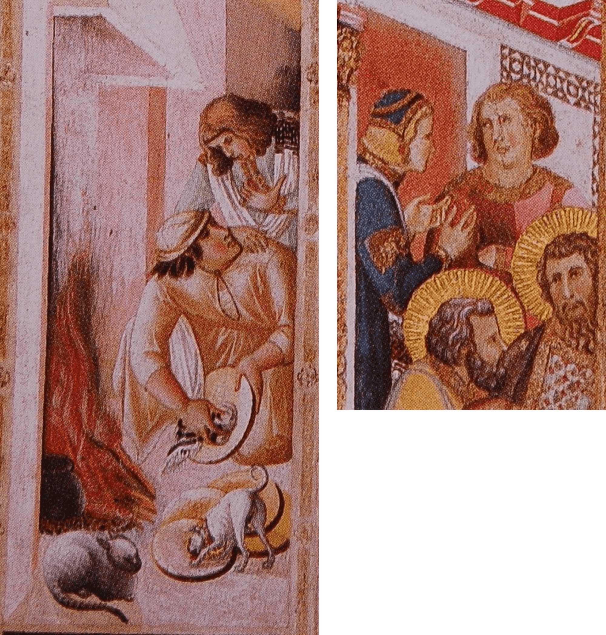 彼らの手のしぐさや独特な衣服は、壁画制作時の中部イタリアの人々にとっては、ごくごく慣れ親しんだものであったに違いありません。彼らは当然のことながら福音書には一切、言及されていない人物たちであり、同主題の先行作例でも登場しません。暖炉の前で居眠りしている猫や皿をなめている犬も同様です。これらはすべて、壁画を見る人々に「最後の晩餐」の場面を身近な出来事として感じ取ってもらう工夫と言えるでしょう。