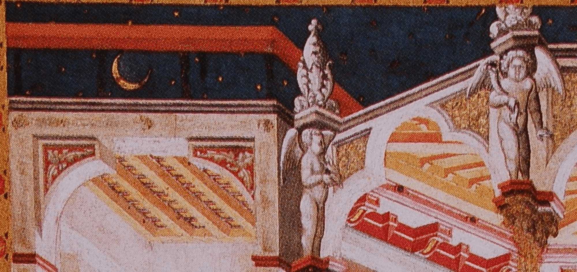 この面において、もうひとつの注目すべき点は背景の描写です。ジョットが中世の金地背景を大きく変えて、現実の空を思わせるような青い色面にしたことはすでに見ましたが、ロレンツェッティは聖書のエピソードに時間という概念を導入したのです。つまりこの壁画の背景は月や星が輝く夜空になっているのです[図11]。