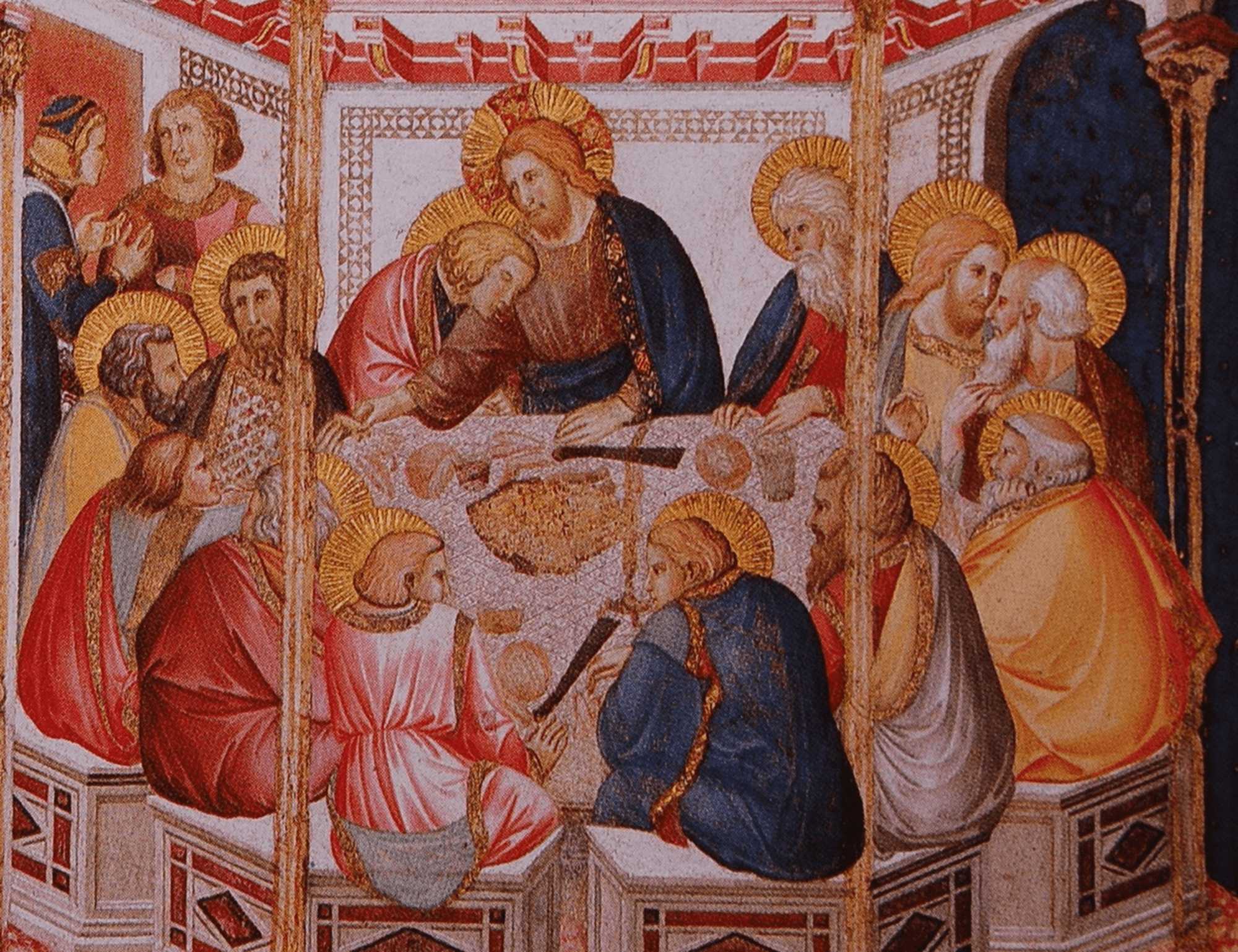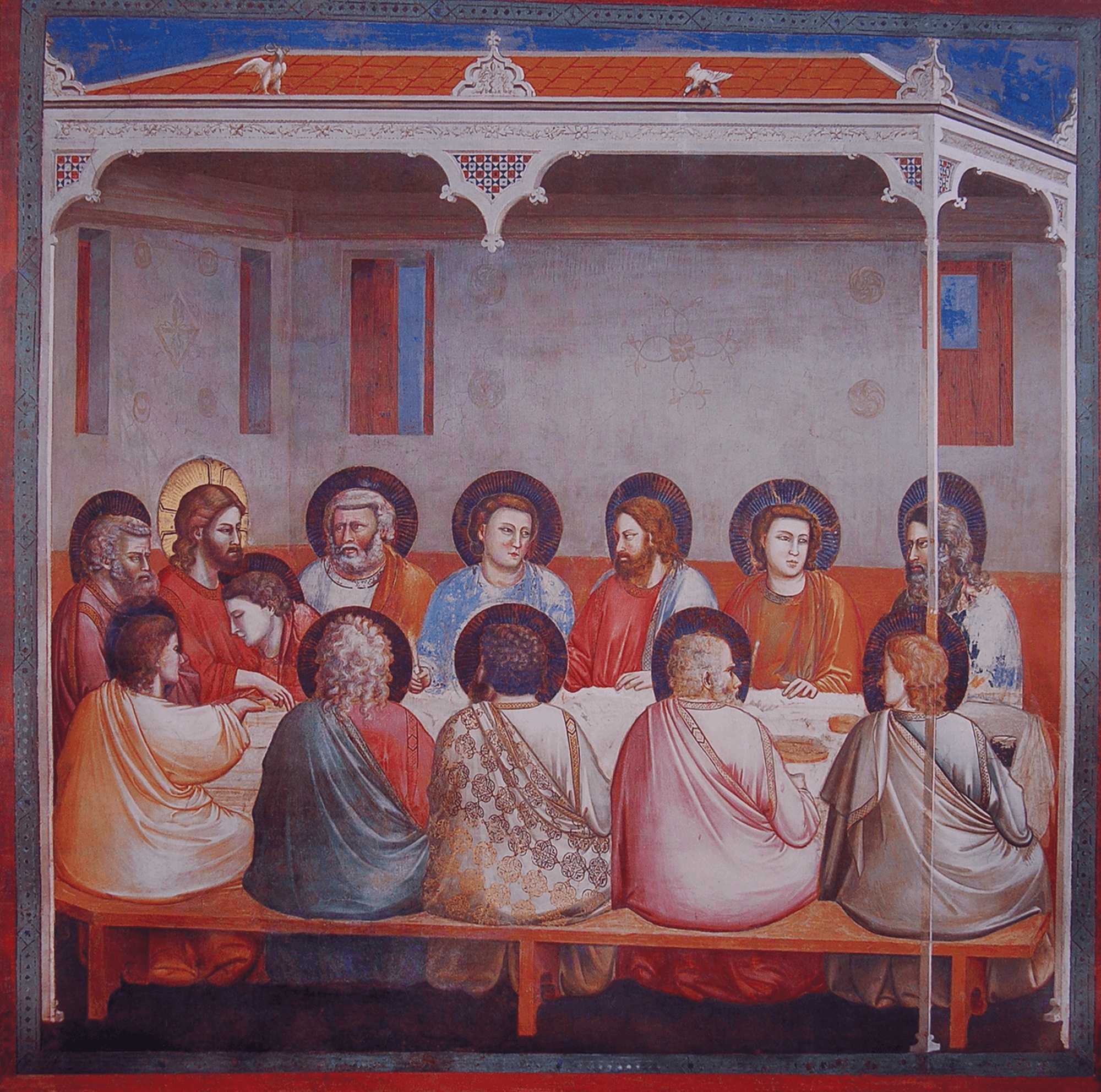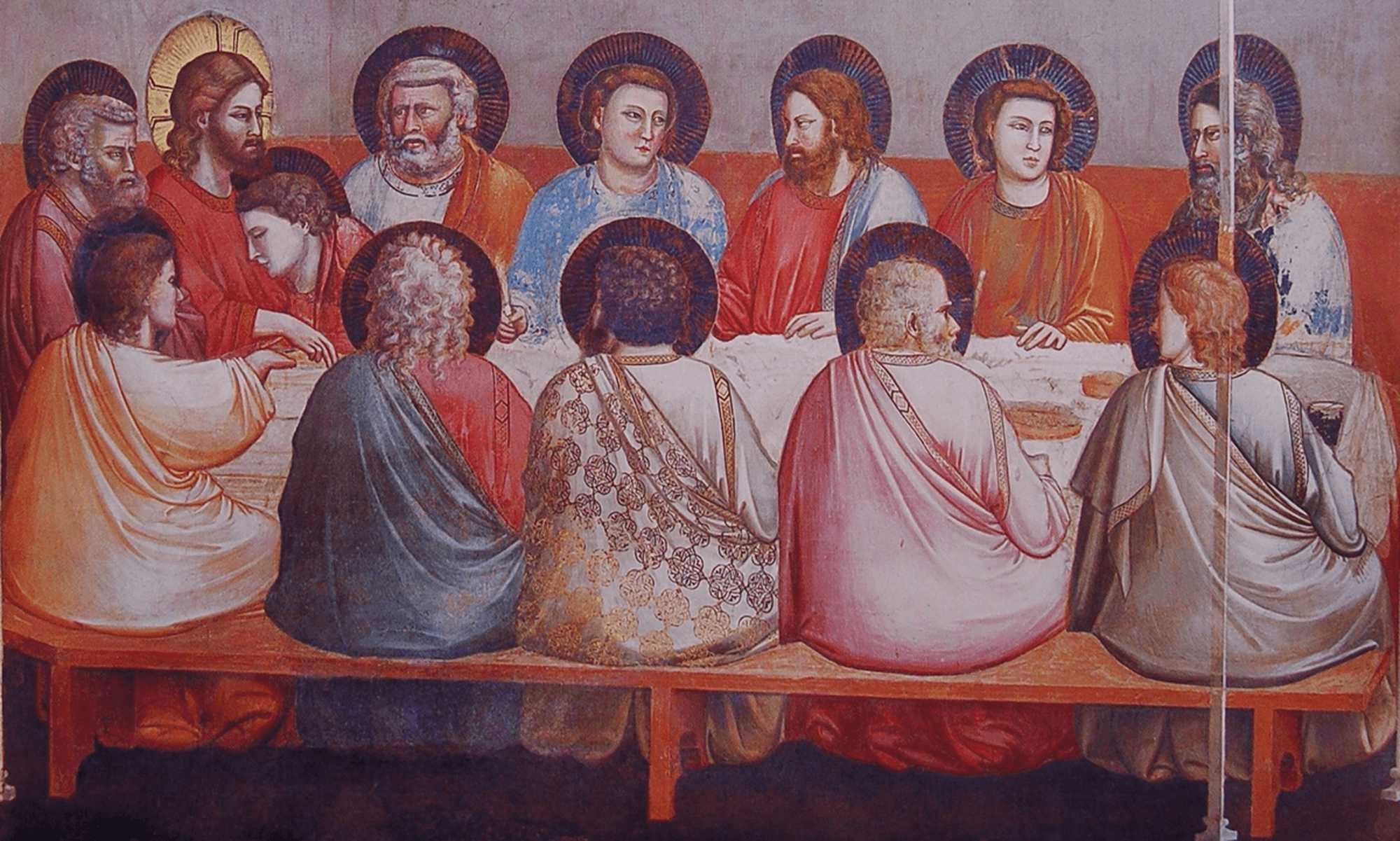 ただしイエスの隣に座っている弟子は無髭(むぜん)の若者になり、師の胸にもたれかかっています。これはペテロから裏切り者が誰なのかを聞くように促されたヨハネが、「イエスの胸もとに寄りかかったまま」(『ヨハネによる福音書』 13:25)、自分の任務を遂行しているところを表したものです。