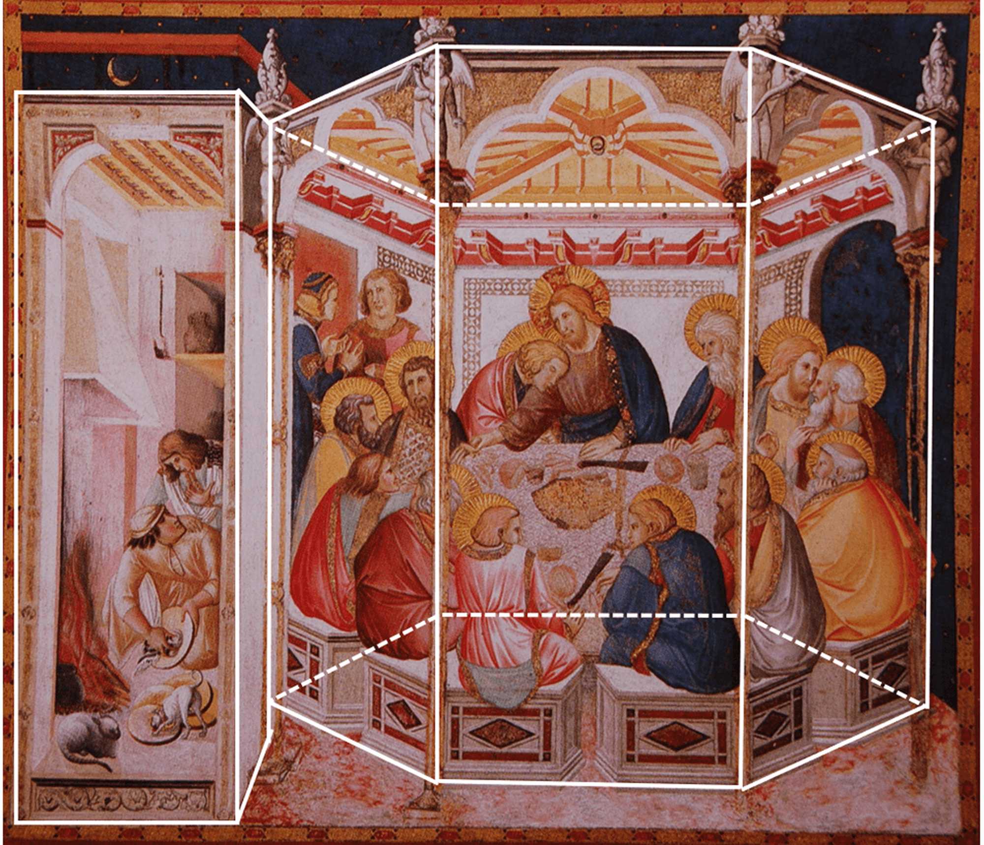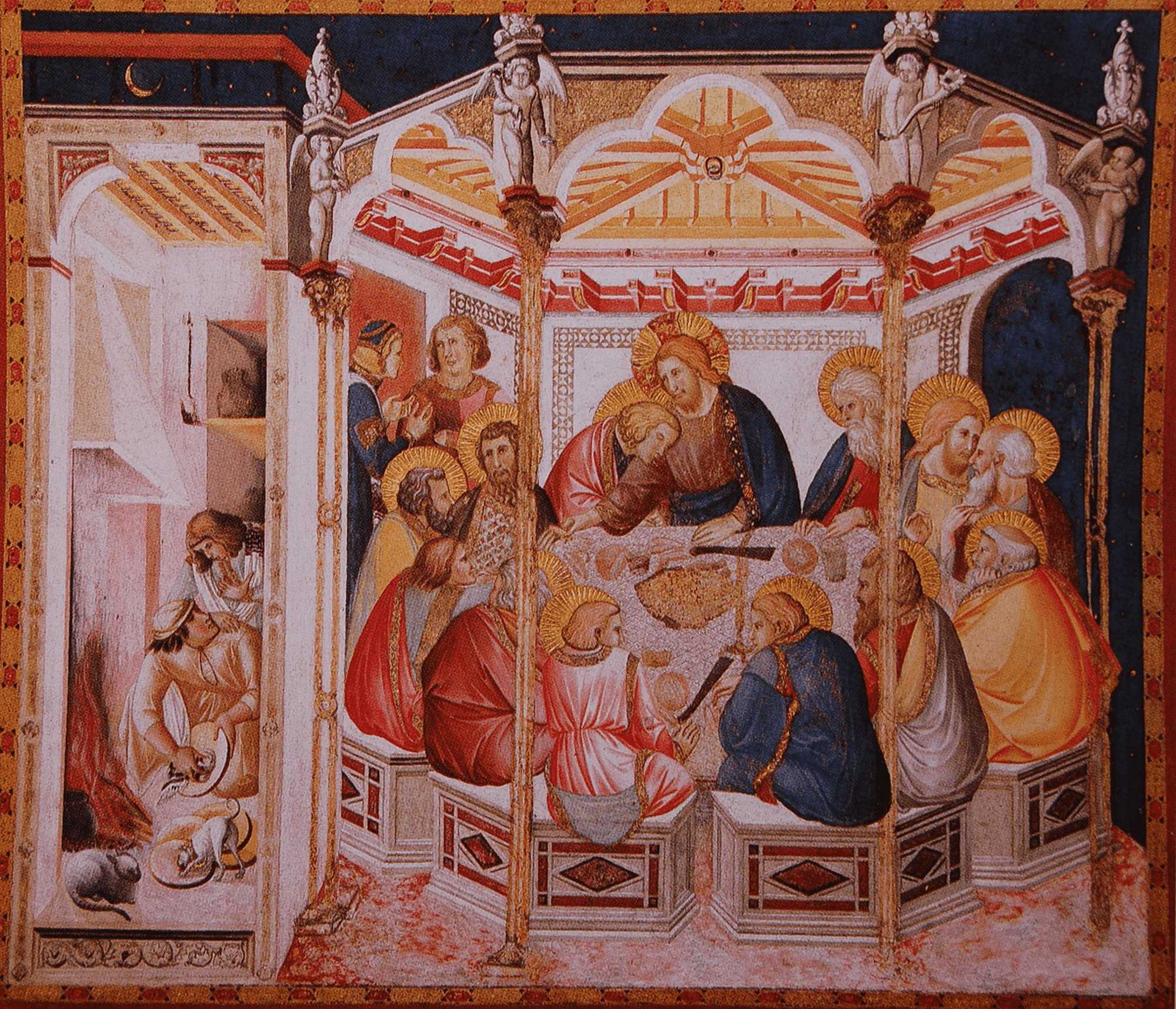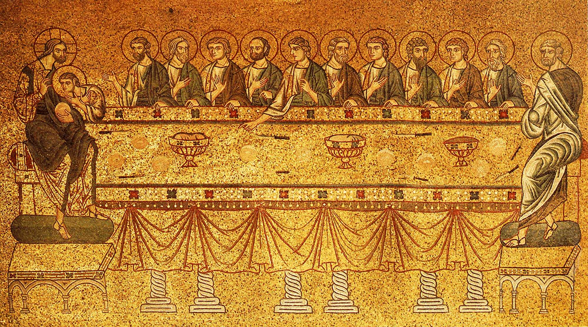 ただしイエスの隣に座っている弟子は無髭(むぜん)の若者になり、師の胸にもたれかかっています。これはペテロから裏切り者が誰なのかを聞くように促されたヨハネが、「イエスの胸もとに寄りかかったまま」(『ヨハネによる福音書』 13:25)、自分の任務を遂行しているところを表したものです。