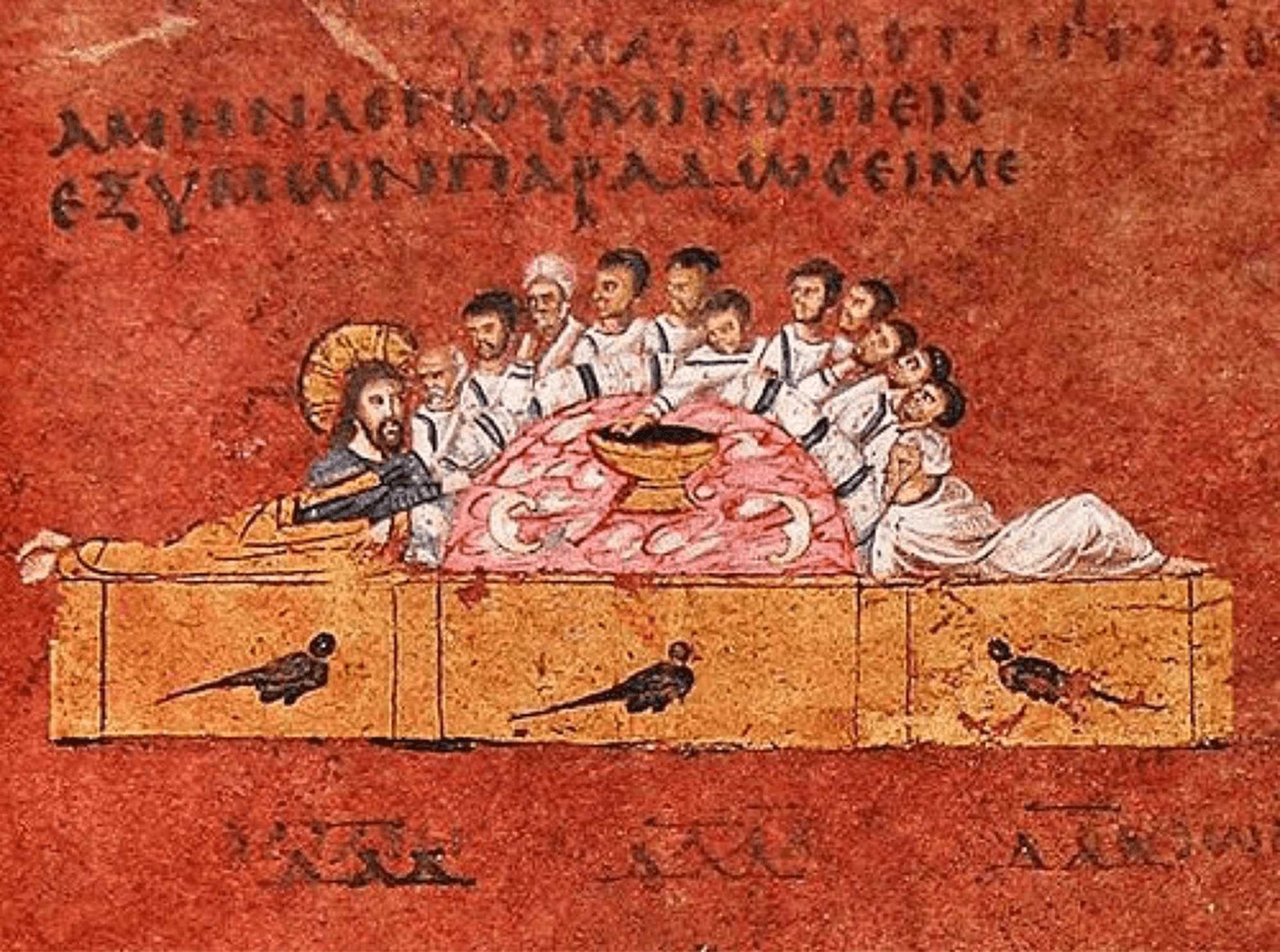 半円形のテーブルの左端にイエス、その反対側に弟子たちのリーダーであるペテロが横たわっていますが、全身像で描かれているのはこのふたりだけです。残りの11人の弟子たちは上半身のみで表され、彼らの真ん中に置かれているのが裏切り者のユダです。彼はテーブル上の鉢に手を伸ばしていますが、イエスも同じ鉢に手を差し出しています。これは「わたしと一緒に手で鉢に食べ物を浸した者が、わたしを裏切る」(『マタイによる福音書』 26:23)というイエスの言葉に基づいています。このことからこの挿絵画家は、裏切り者が明らかになった瞬間を描き出そうとしていることがわかります。