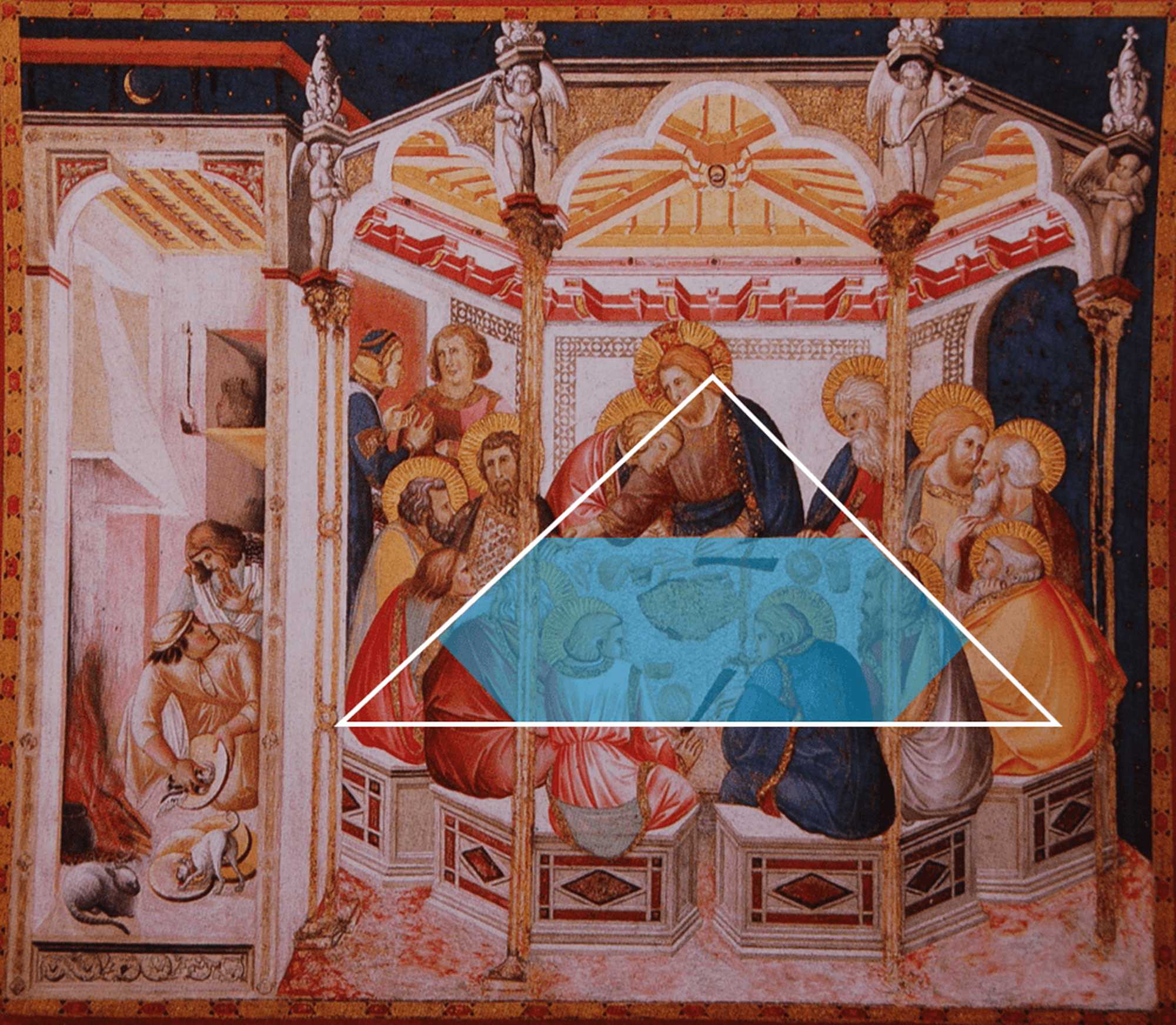 するとイエスは、「わたしがパン切れを浸して与えるのがその人だ」と応えるのですが、彼はまさにパンを左下のユダに向けて差し出しています。そしてそのパンを受け取るために右手を差し出す裏切り者からは、すでに光輪が消滅しています。この4人の中心人物が六角形のテーブルを挟んで二等辺三角形上に配置されることで、それぞれの間に緊密な関係性が生じるのと同時に、画面全体に安定性が与えられています[図9]。
