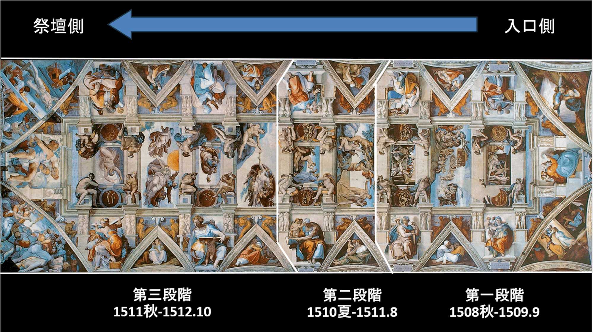 14世紀以降、多くの画家たちは遠近法を駆使して、画中の手前(画面の最底辺)から最深部(地平線)へと向かう3次元的な空間を案出することに精力を注いできました。『創世記』連作でも、《大洪水》や《原罪と楽園追放》[第7回 図2, 5]で見られるように、第二段階までは、この伝統的な手法に則って描かれています。それが第三段階で大きく変更されたのは、この表現法が20メートル下から見上げる天井画ではあまり有効ではないとミケランジェロが考えたからでしょう。