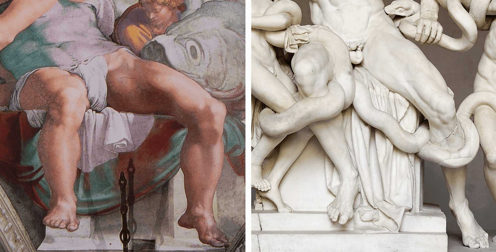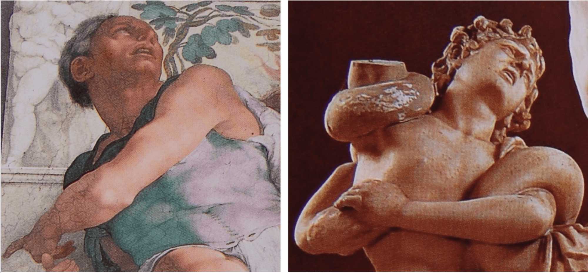 《ヨナ》[図4]を《ゼカリア》[図3]と比べると、体全体がひとまわり大きくなり、ポーズもダイナミックになっています。《ゼカリア》が椅子に行儀よく座っているのに対して、《ヨナ》は上半身を大きく傾け、右足は宙に浮かせています。彼は天の神に向けて、悔悛の思いを必死に伝えようとしているようです。ここには明らかに《ゼカリア》にはないヘレニズム的な表現が見て取れます。そしてその特徴はまさに《ラオコオン》[図5]に由来しているように思われるのです。