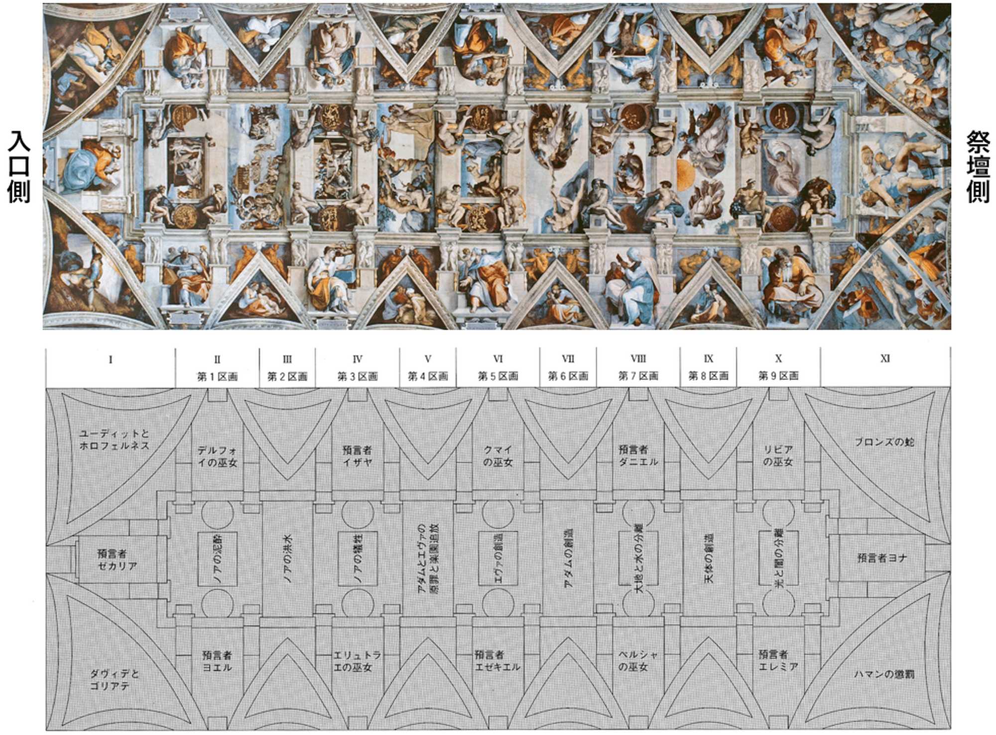 最初、ユリウス2世は12使徒を描くように依頼するのですが、それに対してミケランジェロは、その案では装飾全体が貧弱になってしまうと反論します。すると教皇は、それならばミケランジェロが好きなように描けばよいと告げたそうです。彼はまず天井の中心に9つの区画を設定し、そこに『創世記』の物語を祭壇側から入口側に向けて展開することにしました[図2]。