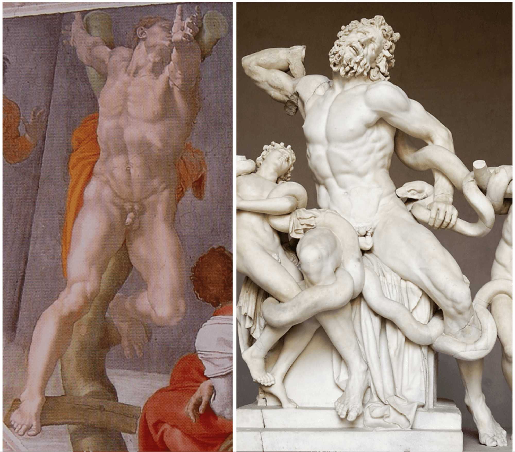 その際に彼がすぐさま思いついたのが、5年前に発掘された《ラオコオン》[図5]であったに違いありません。したがって、教皇からの要請によって壁画が一旦公開された1511年8月は、第二段階と第三段階の境目というだけでなく、クラシック的表現とヘレニズム的表現の分岐点と定めることができるのです。
