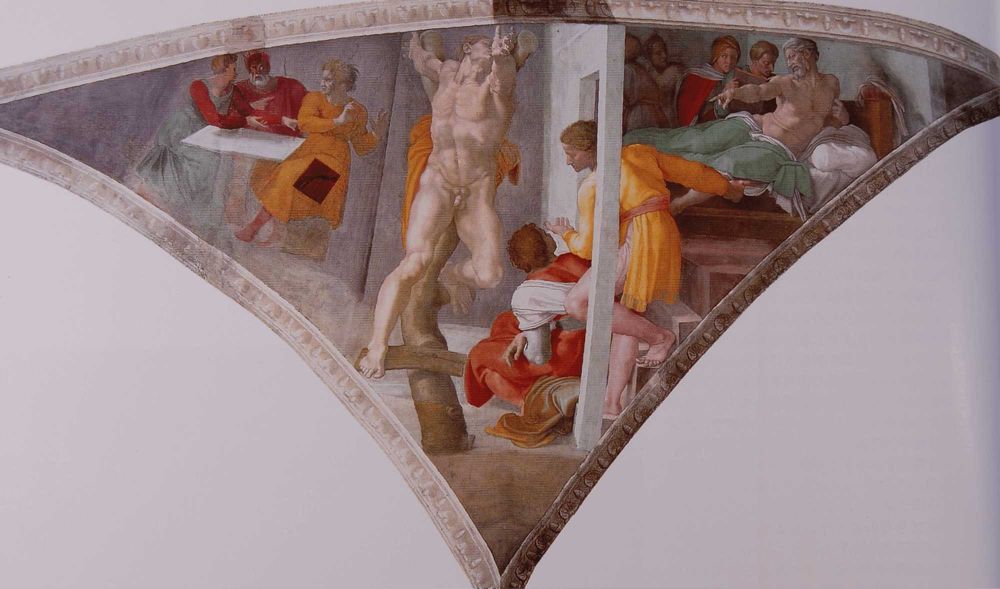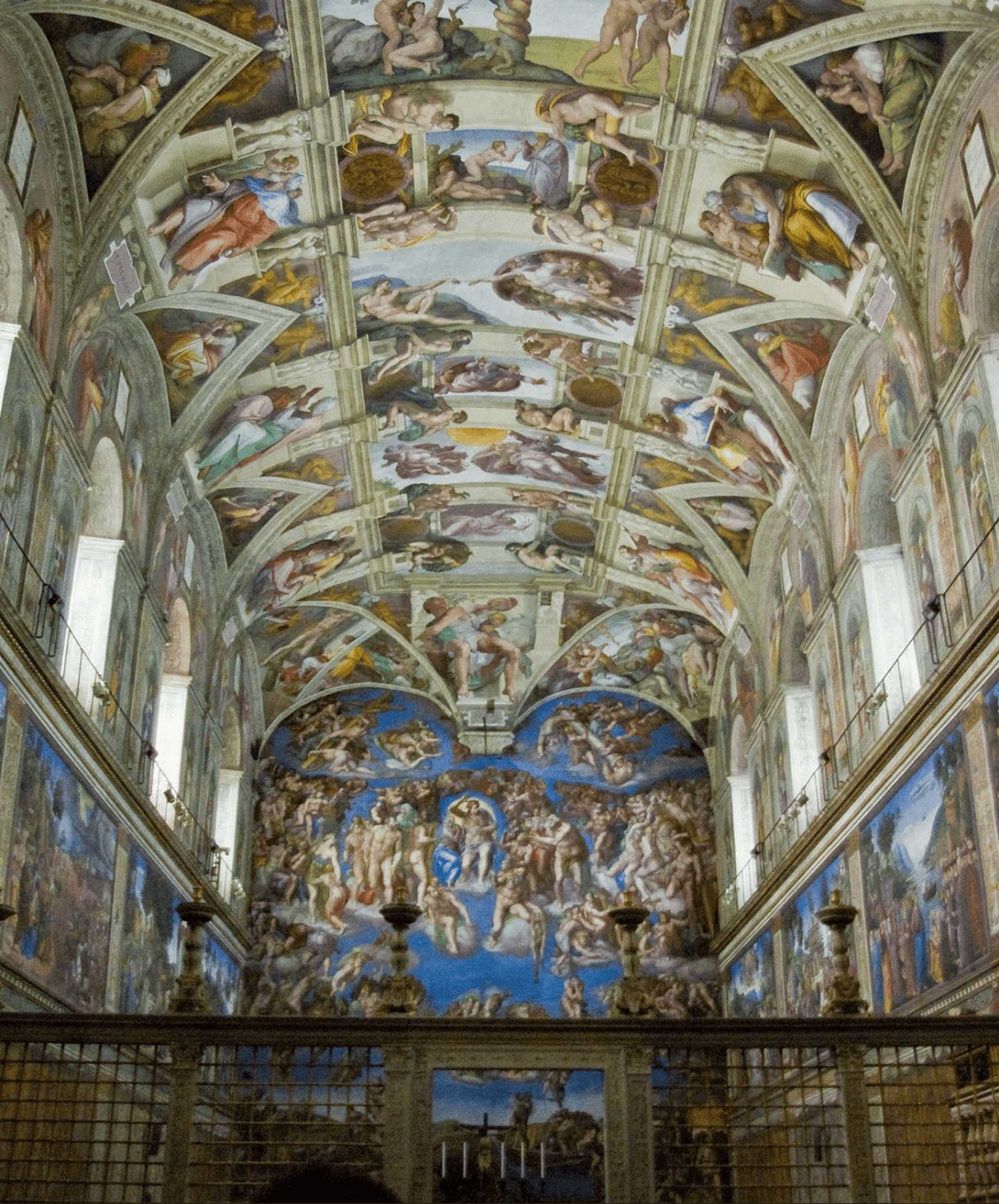 ところでミケランジェロは1508年から4年間に渡ってローマにあるシスティーナ礼拝堂の天井装飾[図1]を行っています。
