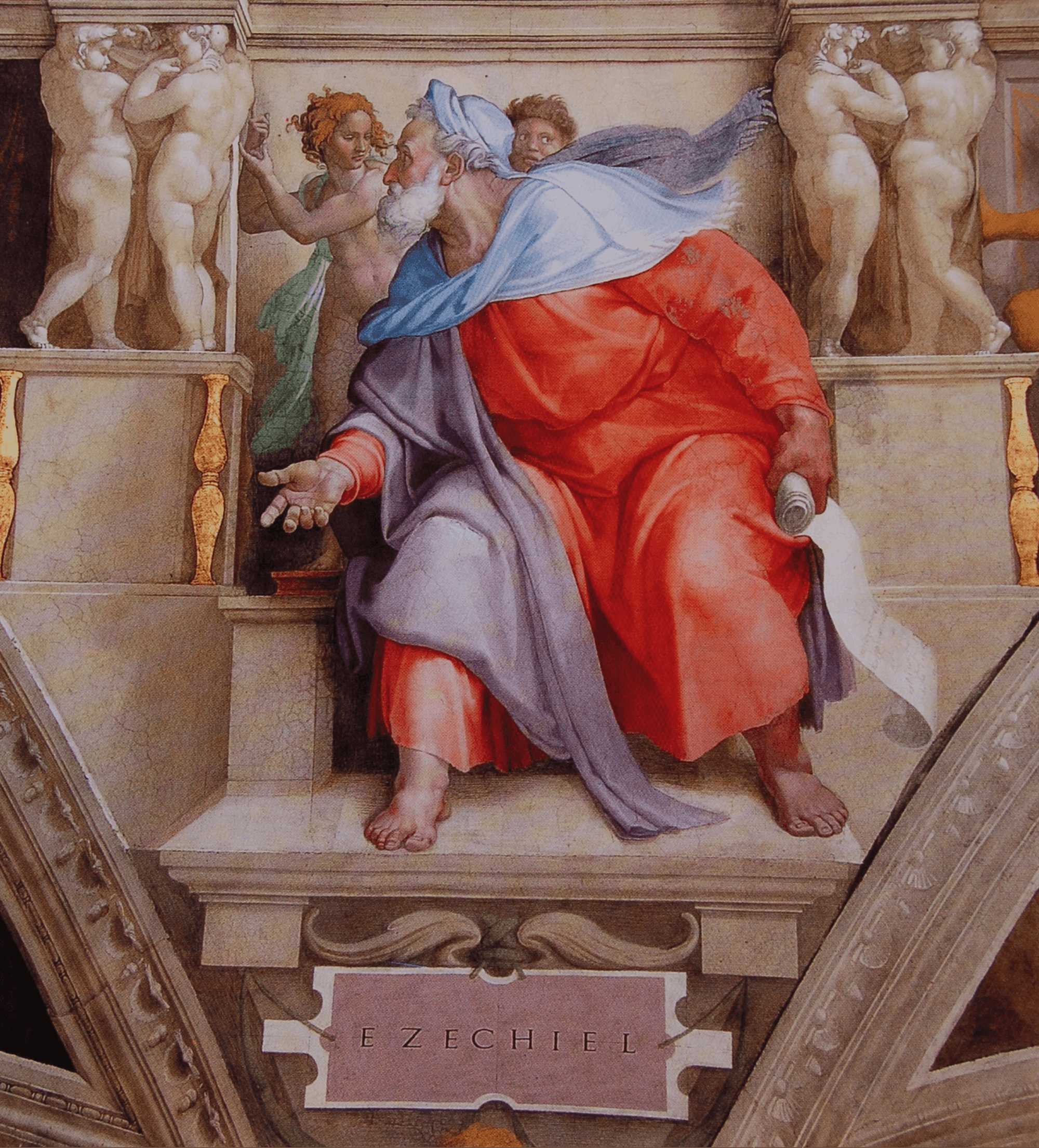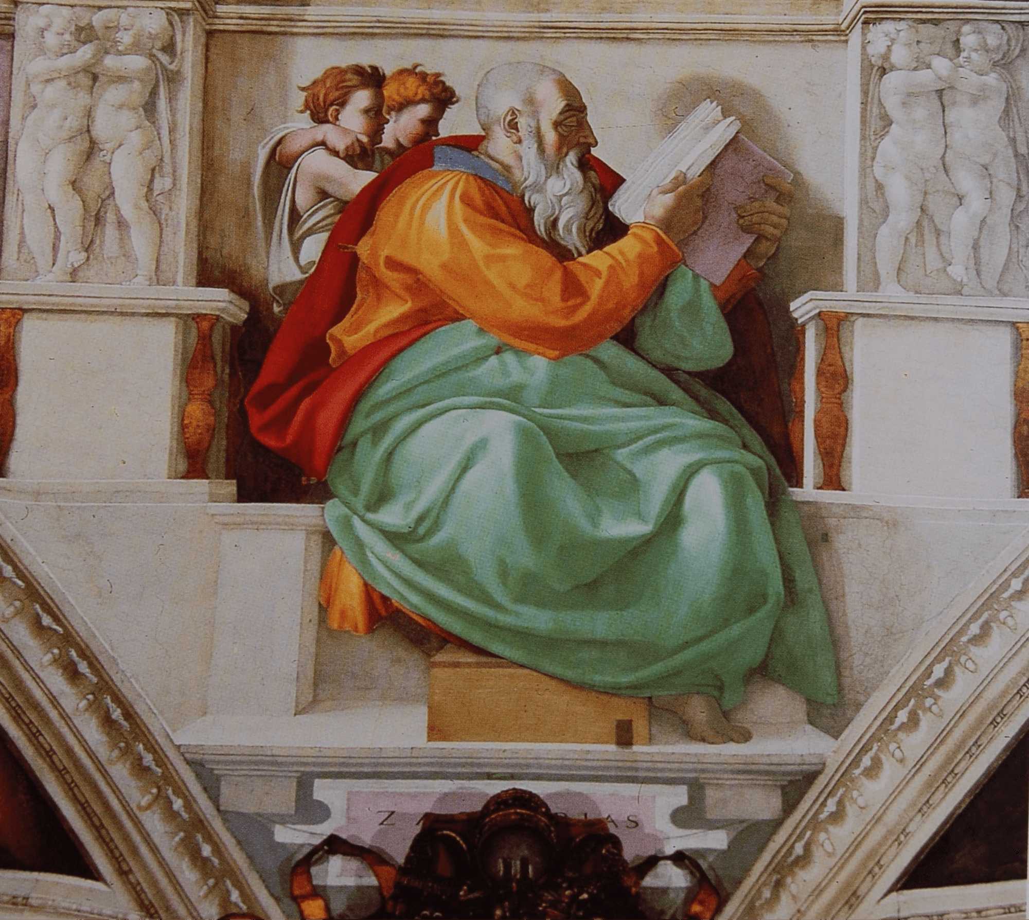 ミケランジェロは天井装飾を入口側から祭壇側へと進めていきました。つまり『創世記』連作の物語順とは逆行する形で制作していったのです。したがって7体の預言者像の内、入口真上の《ゼカリア》[図3]は最も早い時期に描かれたものと考えていいでしょう。
