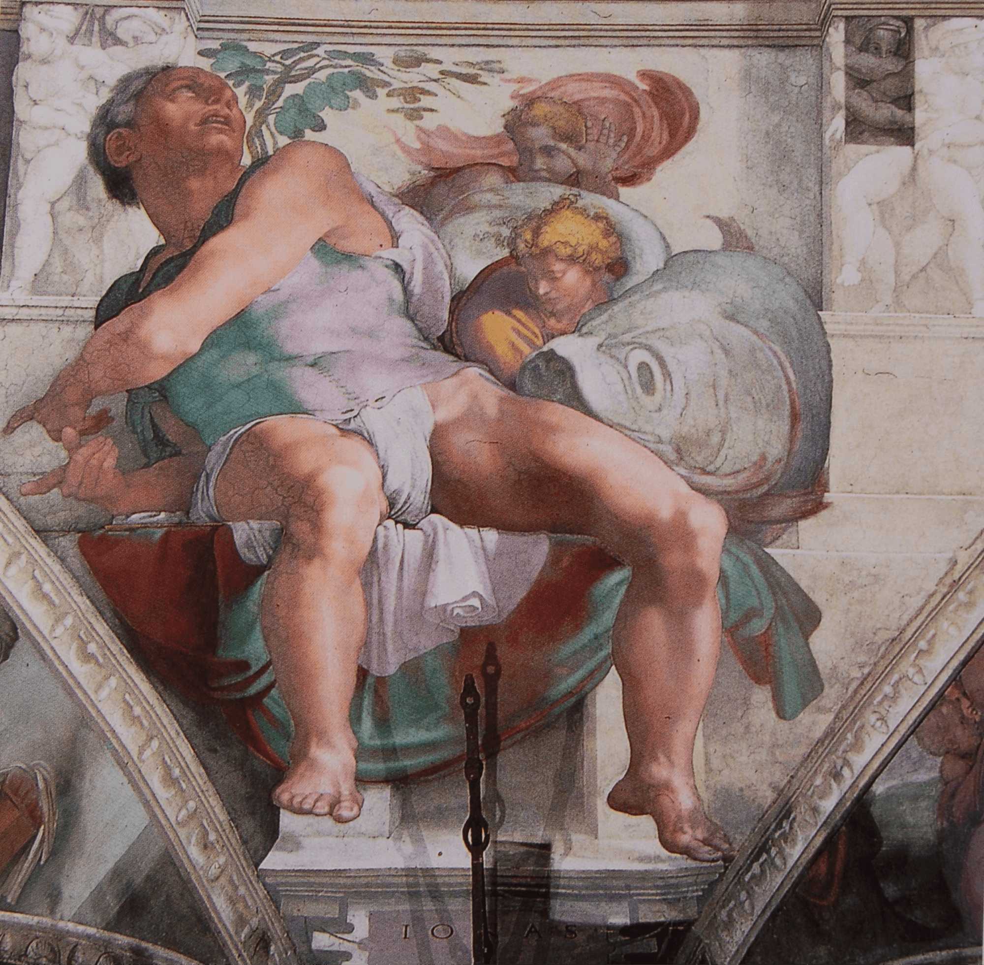 ヨナは紀元前9-8世紀の預言者で、ある日、神からアッシリアの首都ニネヴェへ行くことを命じられます。ところが彼はその要請を拒み、タルシシュへ向かう船に乗ったので、神の怒りを買い、強烈な嵐により船は難破しそうになります。ヨナから事情を聴いた船員たちが彼を海に放り込むと、途端に嵐はおさまりました。ヨナは大きな魚に飲み込まれてしまいますが、魚の体内で神に祈り続けていたところ、3日後に彼は吐き出されたのです。この出来事はキリスト教会では、磔刑[たっけい]の3日後に復活したイエスの予型(タイポロジー)と考えられました。