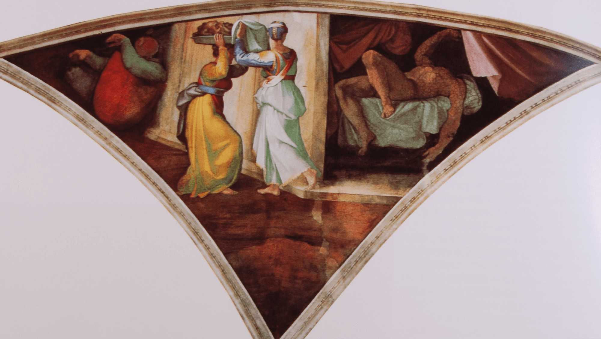 物語場面において前期と後期の様式上の違いを明確に把握できるのは、天井の四隅に描かれた壁画でしょう。入口の真上で《ゼカリア》[図3]の左側に描かれている《ユディトとホロフェルネス》[図8]では、旧約聖書続編『ユディト記』に記された物語を表しています。