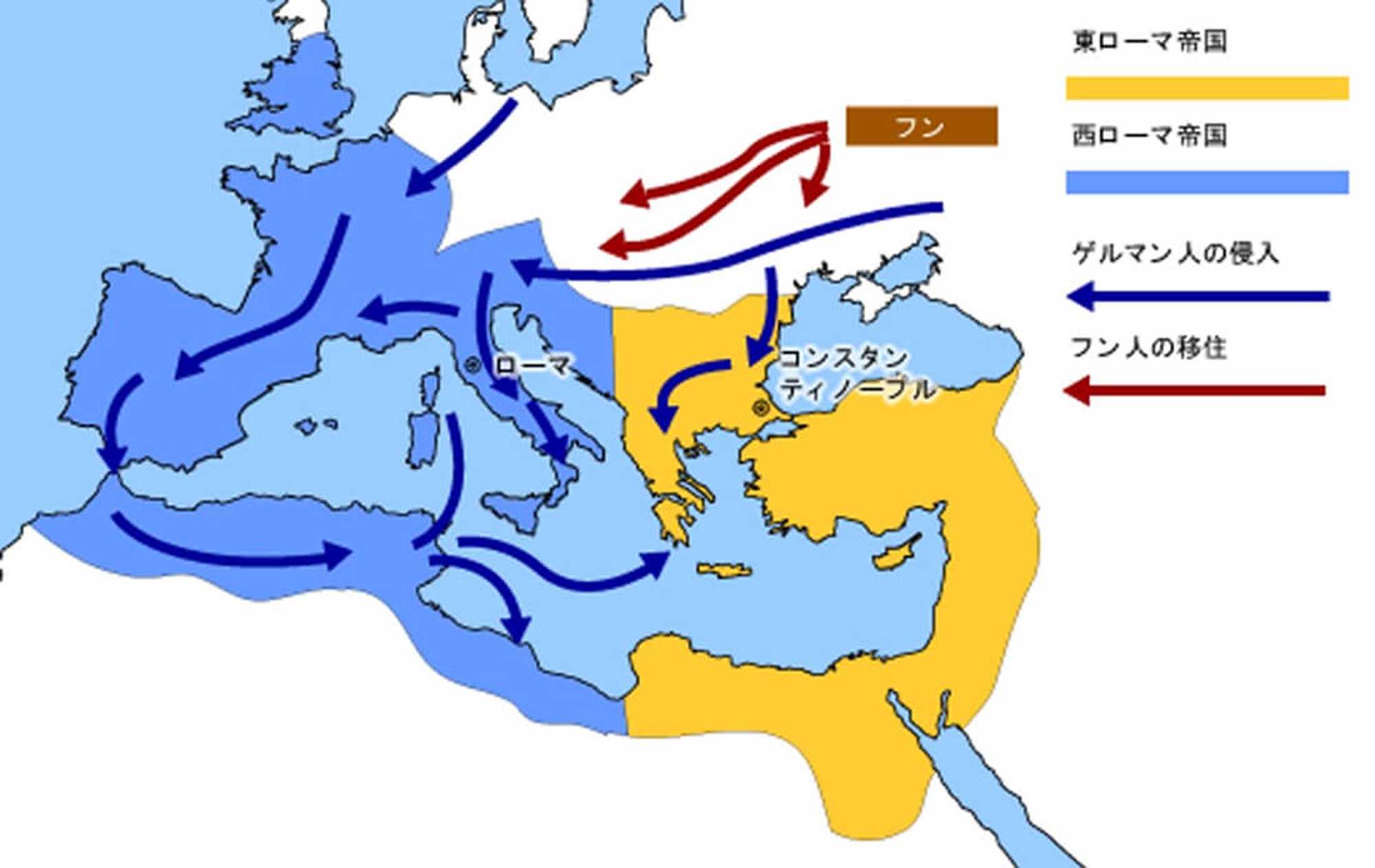 4世紀後半、フン族による北東ヨーロッパへの侵攻によって、ゲルマン人がローマ帝国内に移ってきます[図3]。彼らに押し出されるようなかっこうで、北イタリアに居住していた人々が5世紀半ばにトルチェッロ島に移住し、その後、この島を中心に700年頃、ヴェネツィア共和国が建国されました。