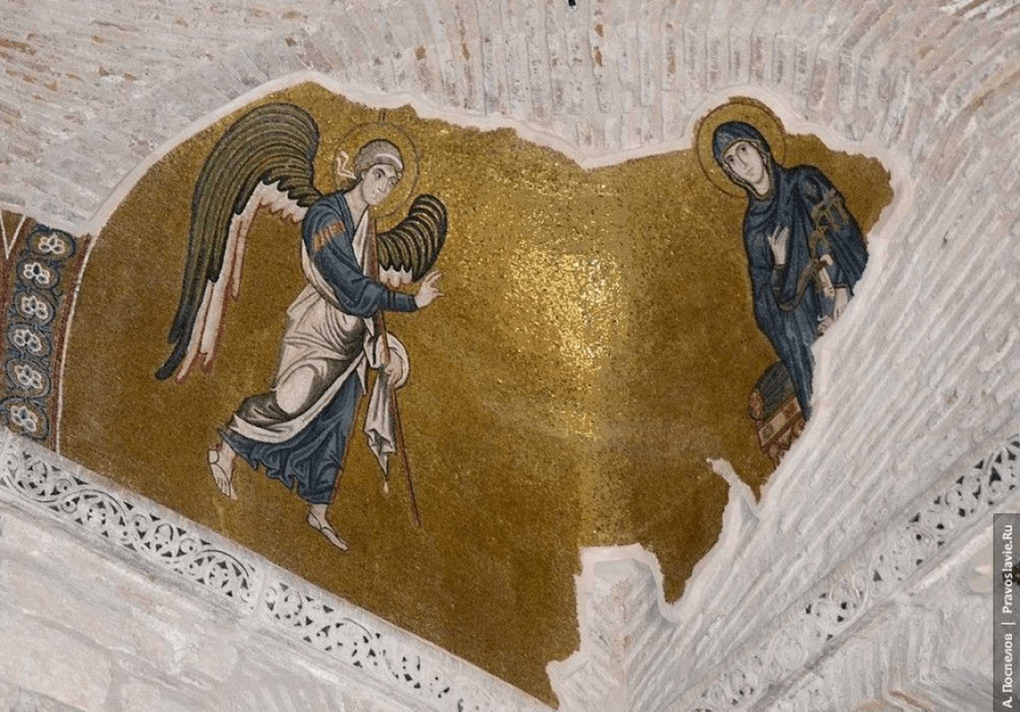 祭壇側左スキンチの装飾は完全に消失してしまっていますが、アテネ近郊のダフニ修道院中央聖堂では、同じ区画に《受胎告知》[図2]が表されていることから、本聖堂でも同主題のモザイクが施されていたと思われます。ここではダフニ修道院の作品をもとに、その主題の内容と図像について考察してみましょう。