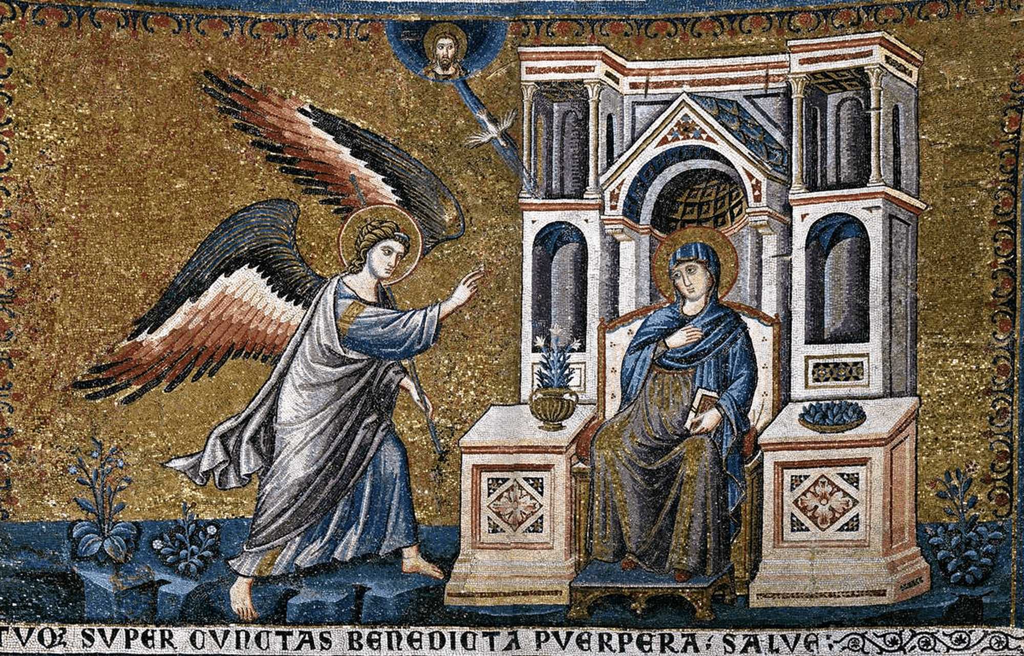 またルネサンス期の「受胎告知」をテーマにした作品では、マリアの処女性の象徴として白百合がしばしば添えられていますが、福音書自体にはこの花に関する記述はなく、ダフニ修道院のモザイク[図2]でも見られません。白百合を「受胎告知」の場面に表すようになるのはおそらく13世紀からで、その初期の作例のひとつとして、ローマのサンタ・マリア・イン・トラステーヴェレ聖堂のモザイク[図4]が挙げられるでしょう。