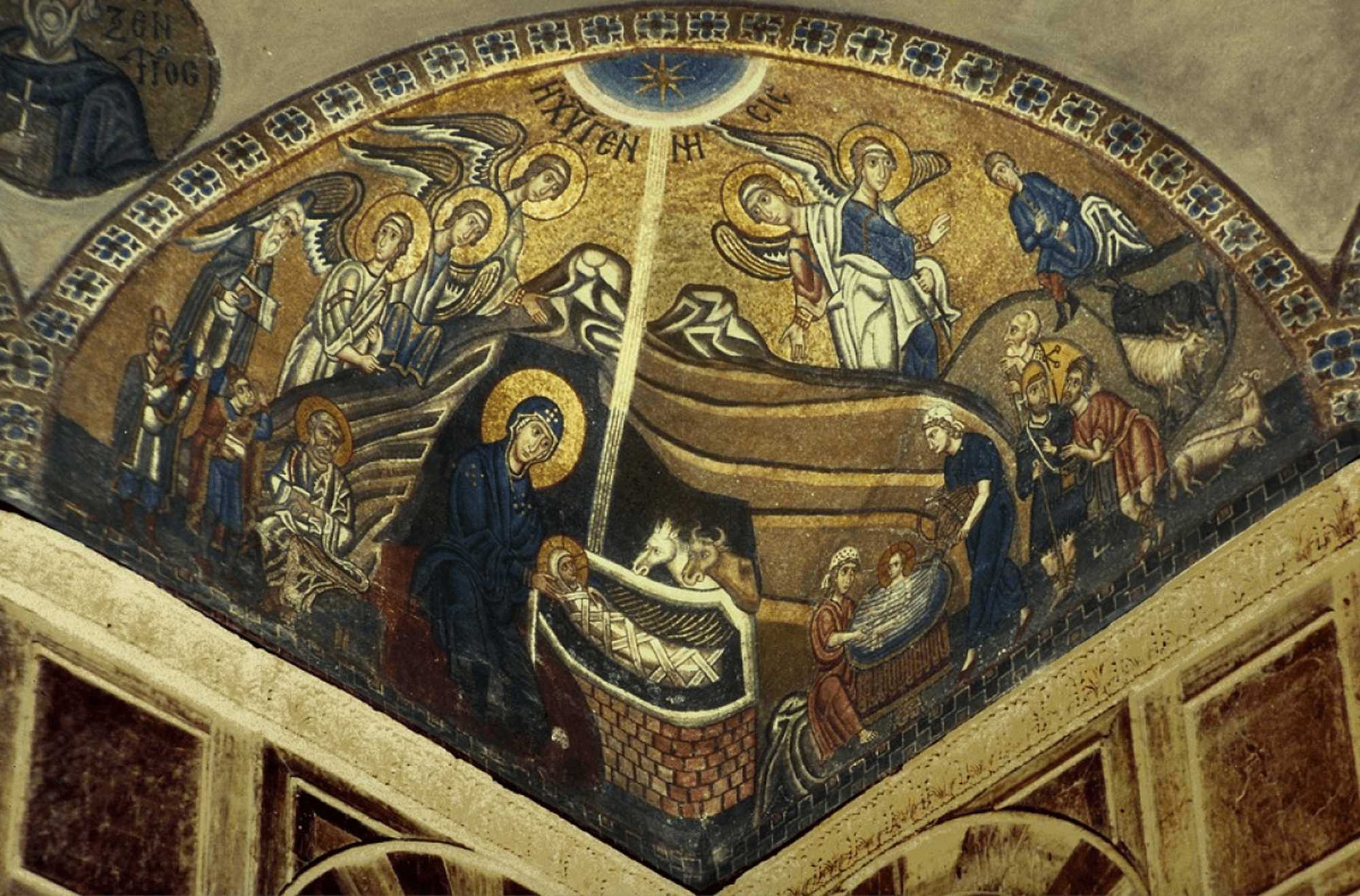 本聖堂のモザイクでは、洞窟が舞台になっていますが、これは『ヤコブ原福音書』(2世紀)に初めて登場します。そこではマリアがベツレヘムの洞窟で産気づいた時、ヨセフが産婆を連れて戻ってくる様子が記されています。その際に洞窟内部は雲で覆われていましたが、一瞬にしてそれが消え失せると、ある場所から強烈な光が放たれ、その輝きが弱まるとそこにイエスが誕生していたというのです。本モザイクでは天の星から洞窟内のイエスに向けて光線が降っていますが、それはこの外典の記述に加えて、天の神と地上のイエスの両者が聖霊によって結びつけられていることを強調しているように見えます。