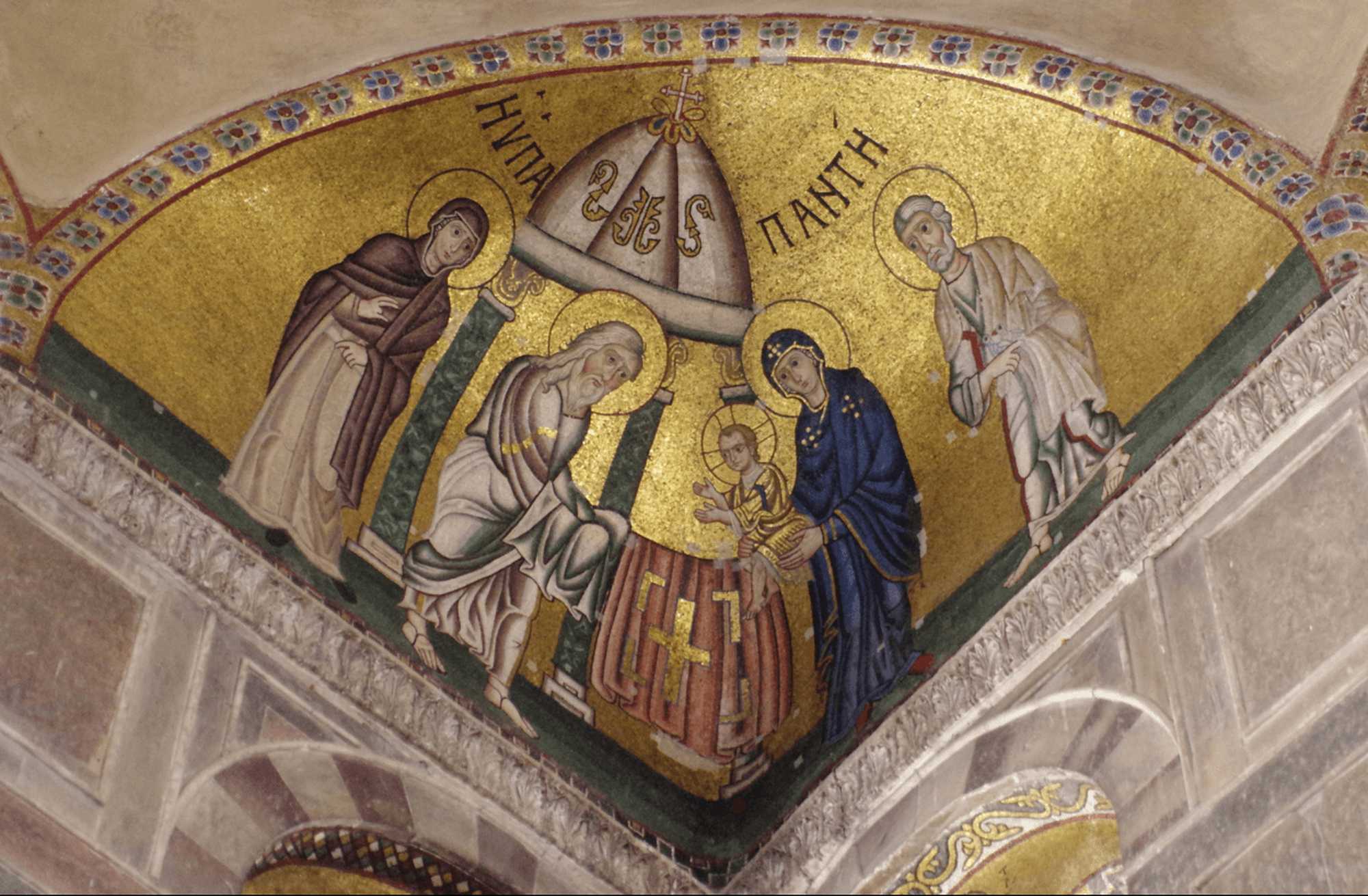 本聖堂のモザイクでは、ユダヤの神殿というよりも、キリスト教会の祭壇とチボリウム(天蓋)が中央に再現されているように見えます。そしてその前で、シメオンがマリアからイエスを両腕で受け取ろうとしています。右側ではヨセフが神へ献げるつがいの鳩を抱え、左側には女預言者アンナがシメオンやイエスの様子を熱心に見ています。