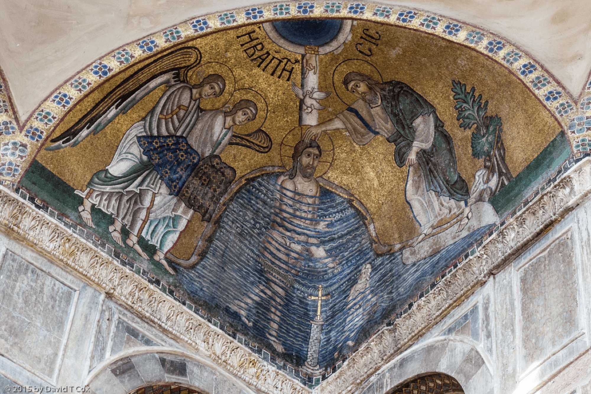 画面中央では全裸のイエスが肩までヨルダン川に浸かっており、洗礼者ヨハネから水をかけてもらっています。その頭上には祝福のしぐさをした手と白い鳩が表されています。『マタイによる福音書』(3:16-17)には、イエスがヨルダン川で洗礼を授かった後、水から上がってくると、天が開いて神の霊が鳩のように自分に降って来るのを見たとあります。そして天から、「これはわたしの愛する子、わたしの心に適う者」という声が聞こえたということです。本モザイクでは、天の神は右手で、聖霊は鳩で象徴され、それが一直線上に置かれることで、「三位一体」を明示しようとしているのです。
