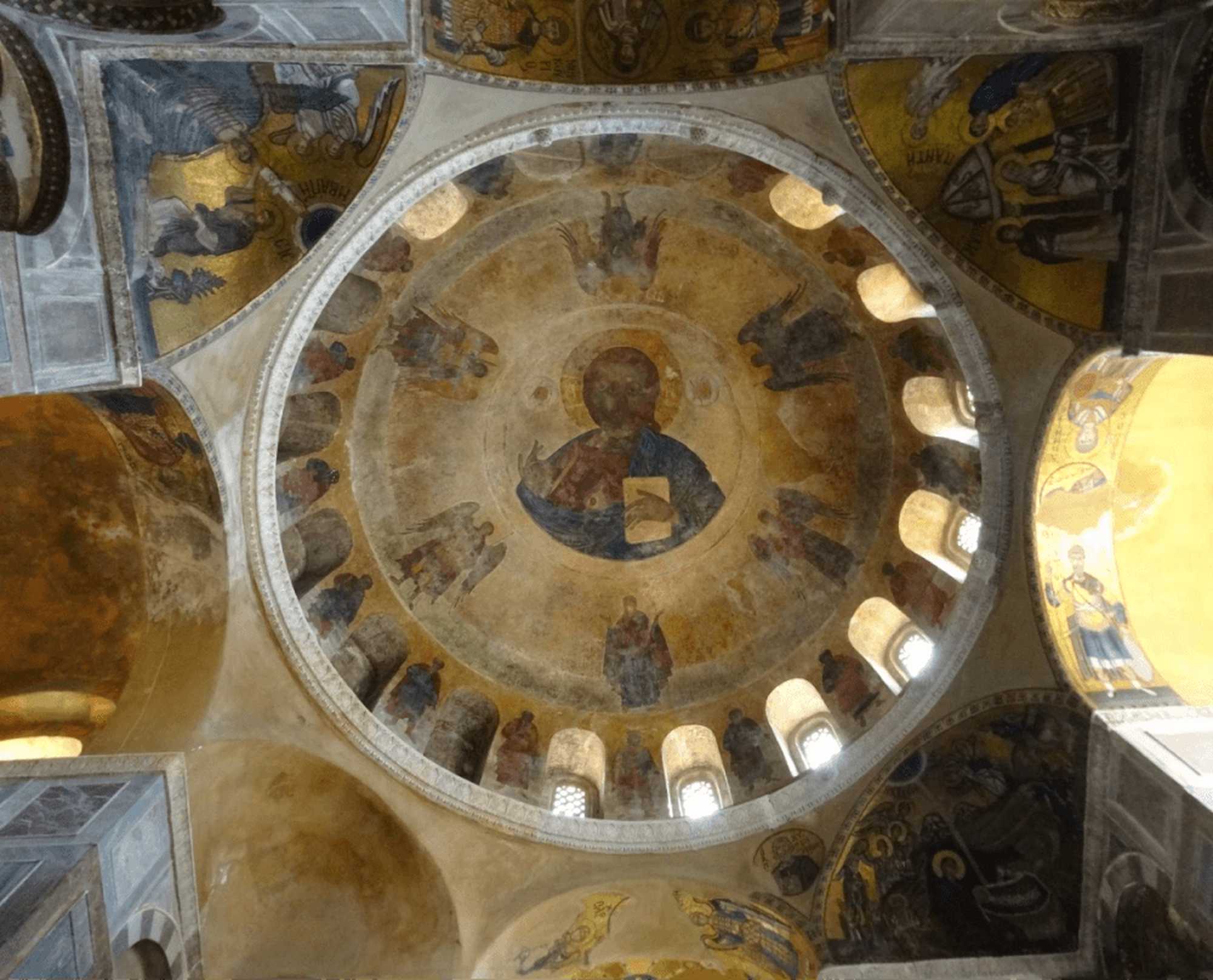 一方、「神殿奉献」はイエスこそがメシアであることを示す主題です。メシアの到来をあらかじめ述べ伝えていた預言者たちは、《パントクラトールのキリスト》が描かれた主円蓋の下の明り窓の層に配されています。それはスキンチのすぐ上方に位置します。