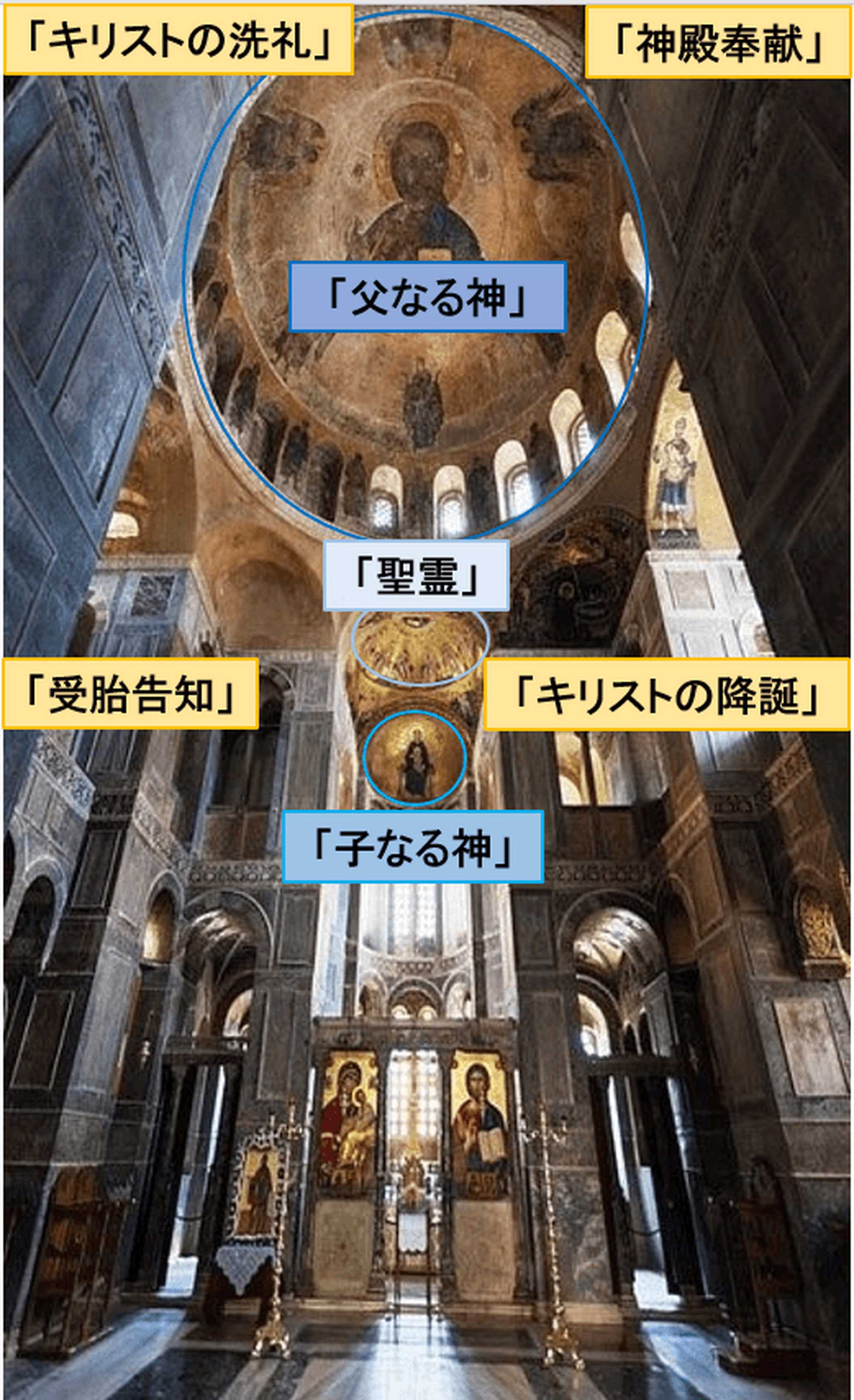 以上の4つの主題が主円蓋の周辺に配されているのは[図10]、単にマタイとルカによる福音書の1~3章に記されているエピソードを、記述順に従って表したということではありません。天からの聖霊によって神の子を生むことが告げられる「受胎告知」、その預言がベツレヘムで実現する「キリストの降誕」、そしてヨルダン川で洗礼を授かったイエスに聖霊が鳩のように降り、神が自らイエスを自身の子であると認める「キリストの洗礼」は、いずれも「三位一体」の概念と密接に結びつくエピソードです。