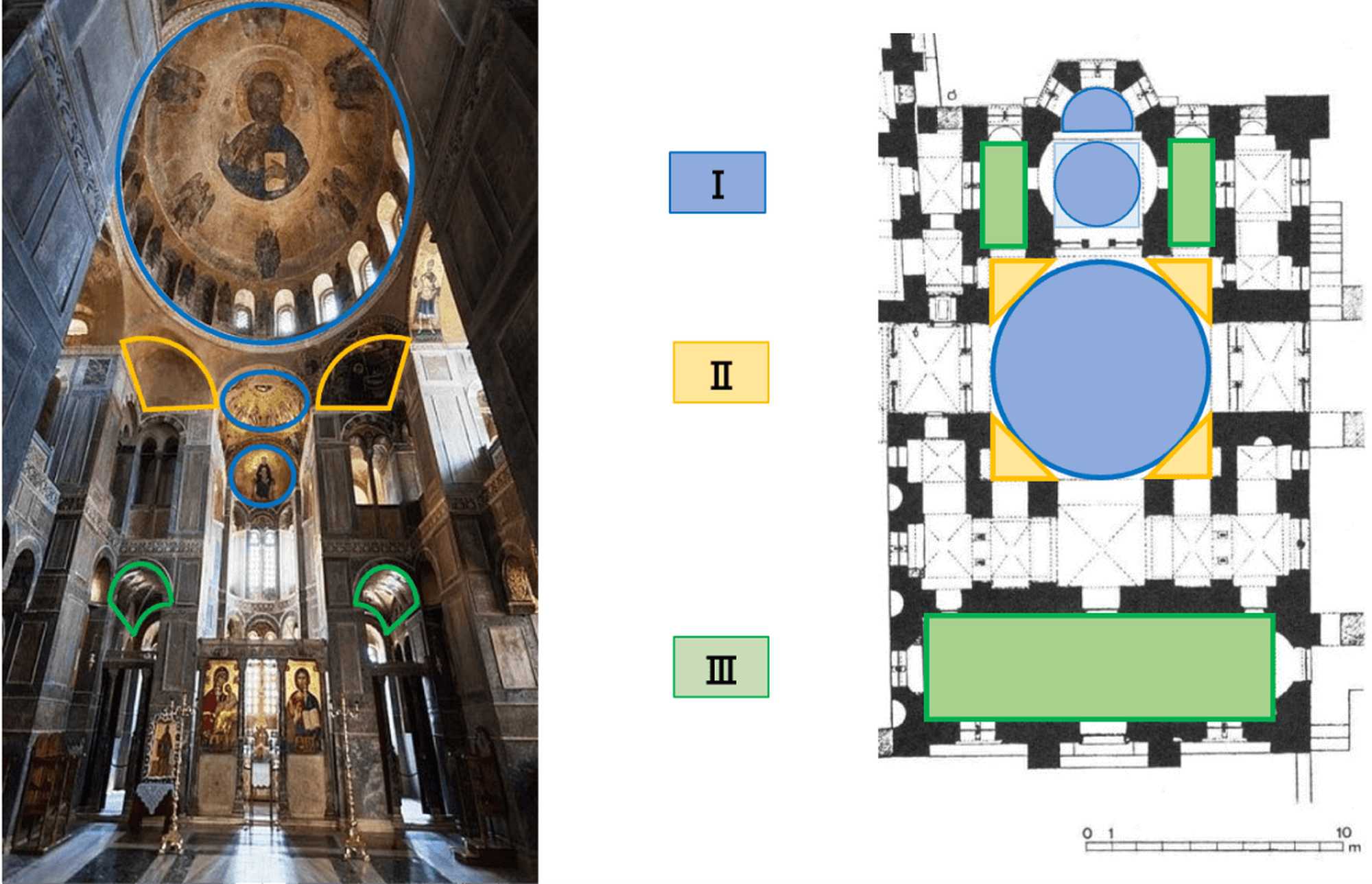 本聖堂内の空間は重要度により3つのランクに分けられ、それぞれの場にはそのランクにふさわしいテーマが設定されているように思われます。前回、取り上げた第1ランクにあたる主円蓋、アプス(後陣)、プレスビテリウム(内陣)では、キリスト教会における最重要概念である「三位一体」が可視化されていました(第17回コラム)。そこで今回は、第2ランクのスキンチ(主円蓋と正方形土台の間のスペース)[図1 オレンジ色の部分]における装飾を見ていくことにしましょう。