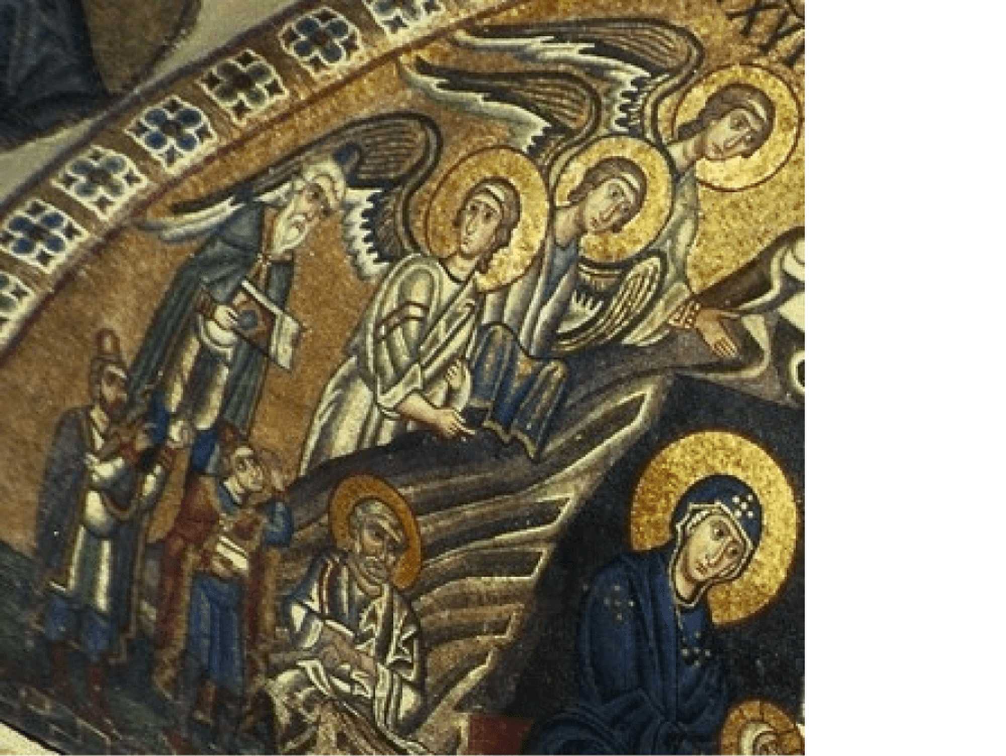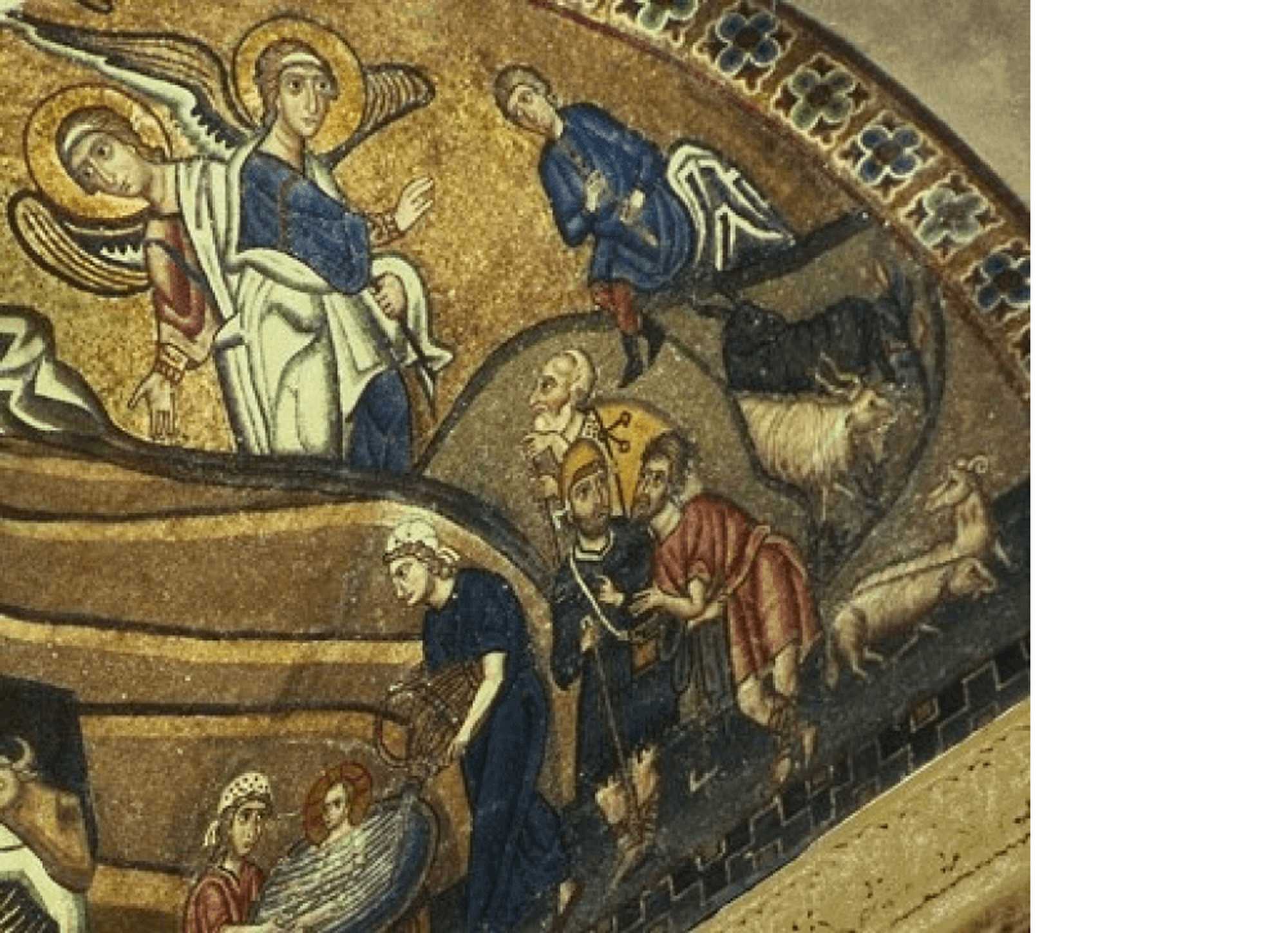画面右側には、『ルカによる福音書』(2:8-16)に記されている「羊飼いへのお告げ」[図6]が表されています。ベツレヘム周辺で夜通し羊の番をしていた者たちに対して、天使は次のように告げます。「今日ダビデの町で、あなたがたのために救い主がお生まれになった。この方こそメシアである。あなたがたは、布にくるまって飼い葉桶の中に寝ている乳飲み子を見つけるであろう」。本モザイクでは、天使はそのまま向きを変えて、羊飼いたちにイエスを指し示しています。