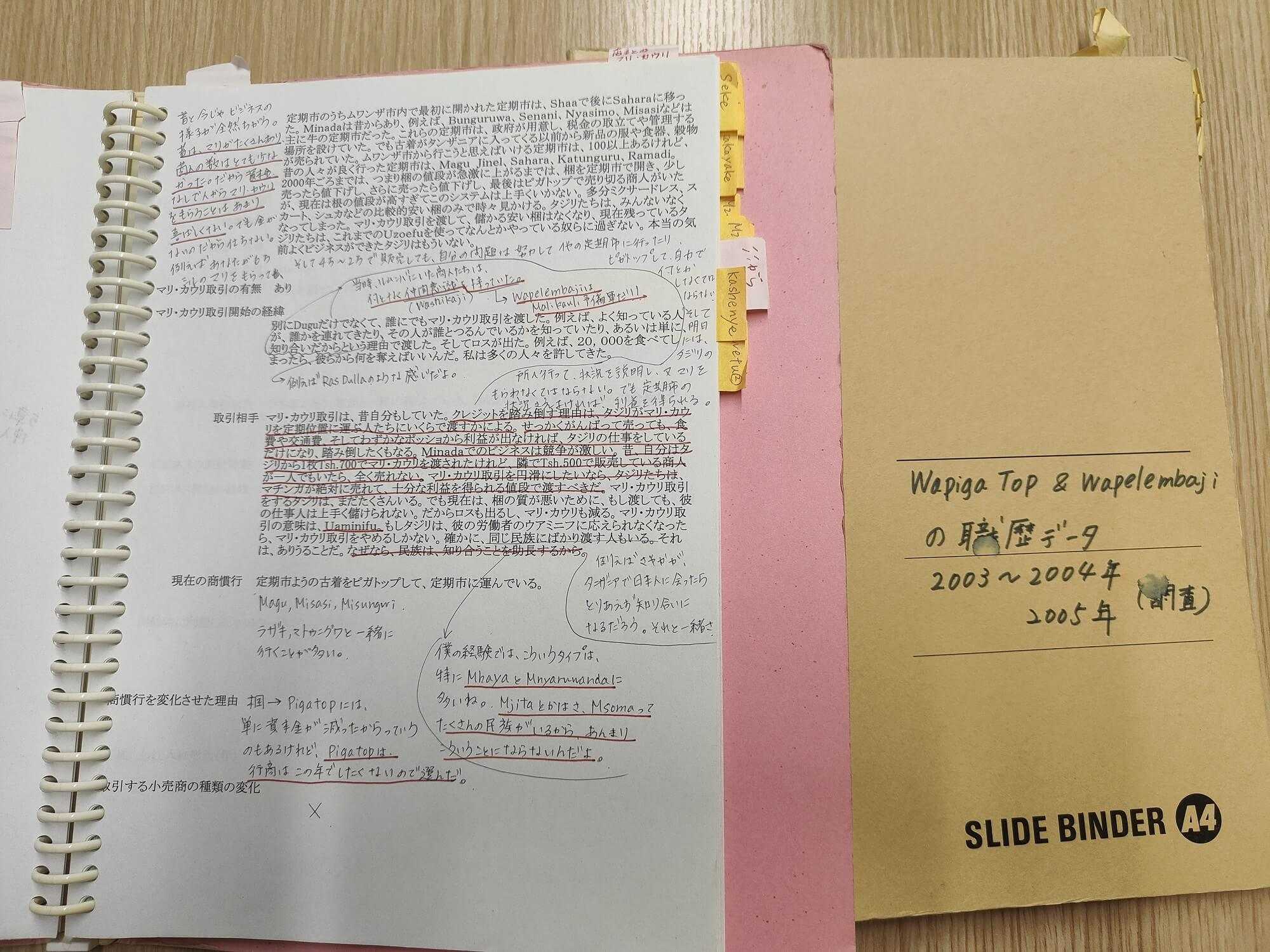 ただ、正直に言うと、それらの情報がどんな成果に結びつくかなど、まったく考えていませんでした。私が現地で毎日考えていたのは、仲間の商人たちを知り、彼らの間でうまく立ち回り、日銭を稼いで商人たちに仲間として認められ、日々を生きぬいていくことだけでした。それでも、六か月、一年と地道に集めた情報を繋ぎあわせると、古着商売や商慣行のしくみや複雑な人間関係がよくわかってきます。それと同時に、たくさんの疑問も湧いてきます。特に私が漫然と書き留めていた人間関係の諸々は、騙しあいや裏切りを織り込んで成立している彼らの商世界について思考する基盤となっていきました。