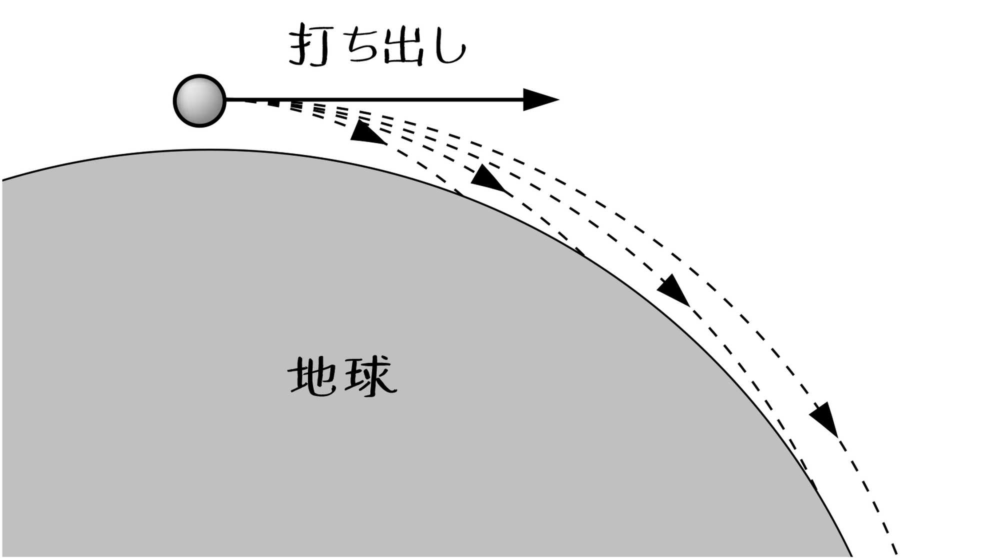 ここで、地球は球体なので、投げ出す速度をうまい具合に調整すれば、リンゴが描く放物線と地球の表面の曲率(曲がり方の割合)が同じになり、リンゴは月と同じように地球の周りを回ることができるはずだ――ちなみに、空気抵抗がないとすると、リンゴを秒速7.9㎞で投げ出せば月と同じように地球を回り続ける計算になります――。そういうふうに考えを進めていったわけです。