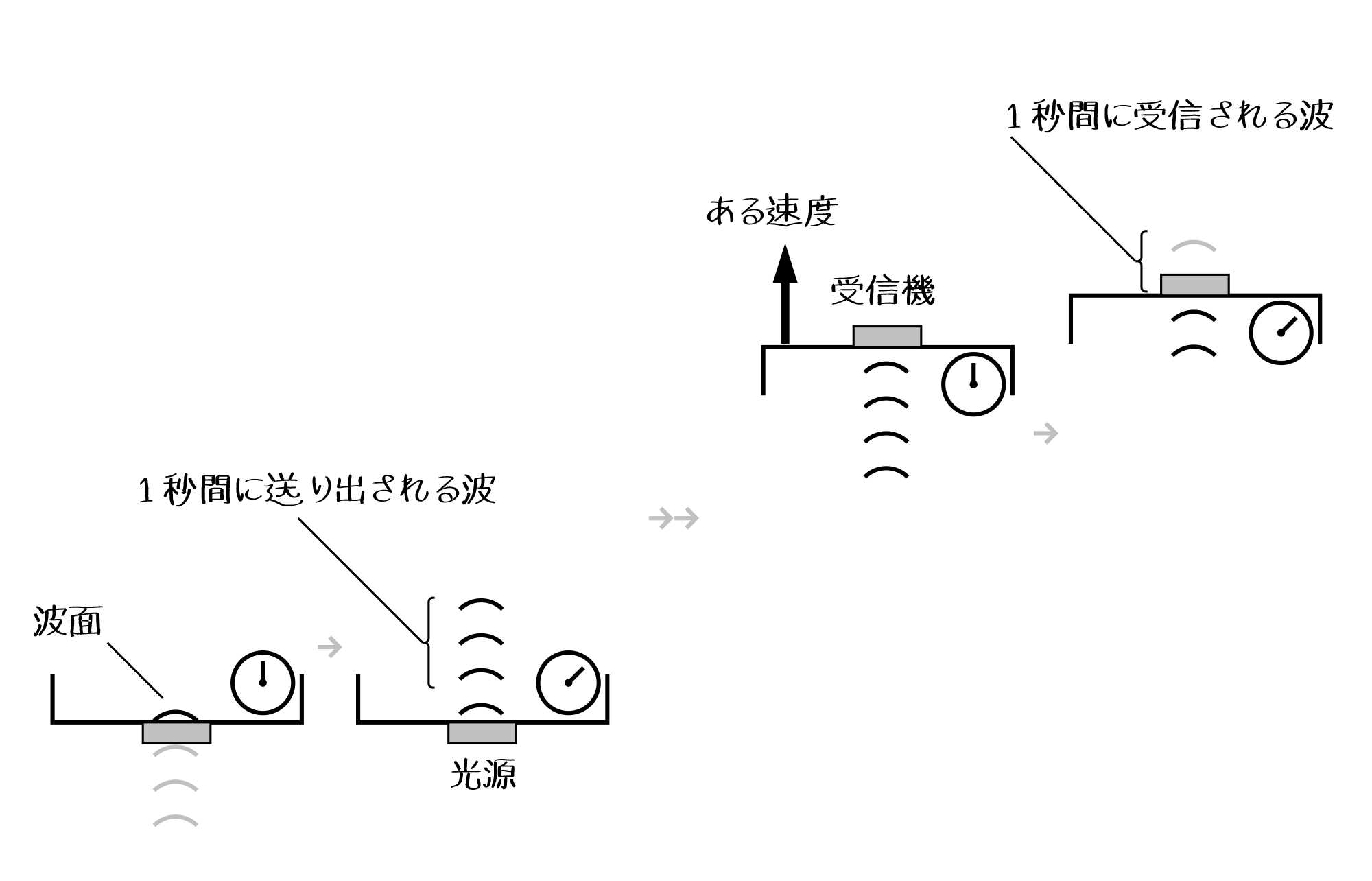 重力のない空間をエレベーターが加速度を持って上に上がっていくと、エレベーターの室内では下向きの慣性力が働きます。このとき、エレベーターの床に設置した光源から天井に設置した受信器に向かって光を放つとどうなるか。エレベーターは加速度をもって上昇しているので、ドップラー効果(受信器が運動するとき、受信される波の振動数が発信源での値と異なる現象)により、天井で受信される光の振動数は発信時の振動数よりも小さくなる。