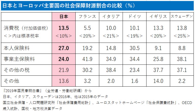 人びとが心身ともに健康であれば、企業は有能な人材をいつでも採用することができます。あるいは、いま問題となっている介護離職を例にとると、優秀な従業員が親の介護のために辞めてしまうのは企業にとって大きな損失ですが、福祉サービスが充実していればそのような事態を避けることができます。つまり、社会保障によって最も利益を受けるのは企業なので、企業が多く負担するという理屈なのです。それではなぜ日本では、消費税にせよ、社会保険料にせよ、国民の負担が大きいのでしょうか。