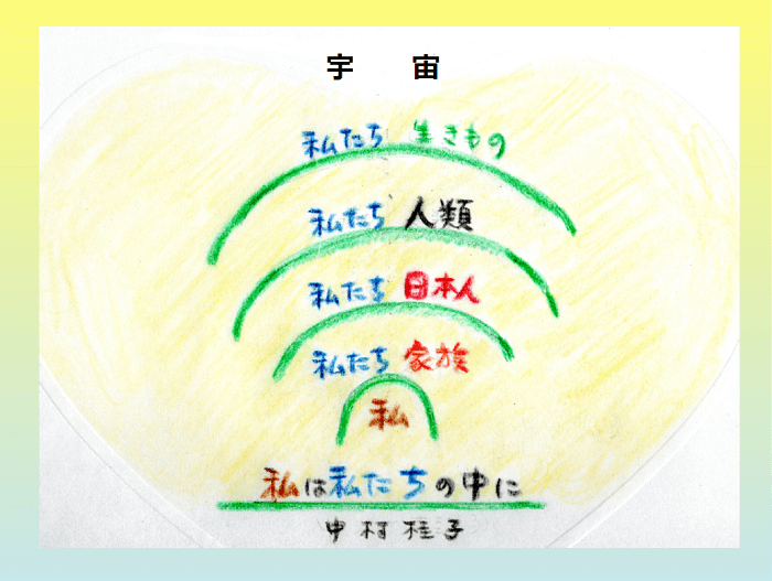 「私たちの中の私」の図を見ていただくと、「私たち生きもの」の上に宇宙があります(実は、最初この宇宙を書き落とした図を載せてしまいましたら、ここに宇宙があるのではありませんかと指摘して下さった方がありました。同じ感覚をもっている方がいらっしゃることを知って嬉しくなりました)。