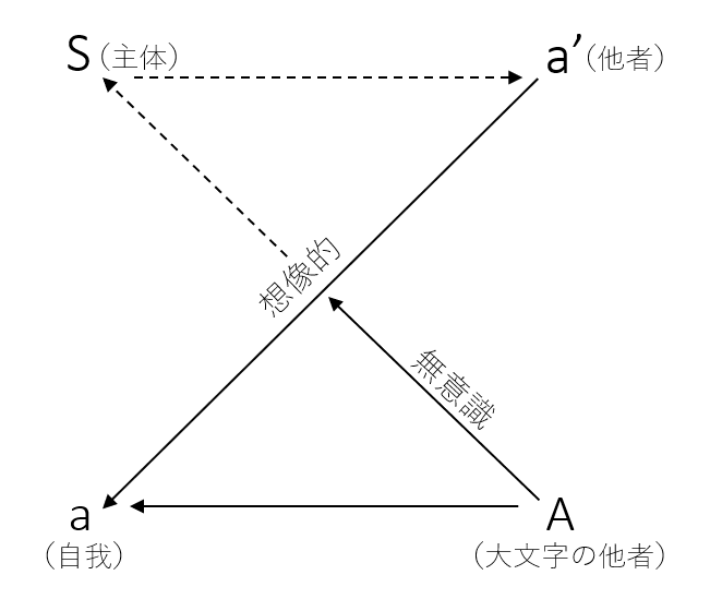 先述した通り、S(主体)はa’(他者)を基にしてa(自我)を形成します。a’に入るものは自らの鏡像、母親、アニメのキャラクター、学校の先生、憧れの先輩、会社の上司など、成長や生活環境の変化に伴って変わっていくのが普通で、私たちの中ではその都度、新しい自我が生成されると考えられます。図に「想像的」とあるのは、この過程が言語的なメッセージによってではなく、鏡像が正にそうであるように、イメージによって進行することを意味しています。このような動きは、しかし、主体によってなされるのではありません。その背後には主体を操る真の主体A(大文字の他者)の存在があります。このAに入るものは言語、神、文化、国家、経済システムなどで、これらのもつ価値基準が、無意識のうちに、主体の認識や価値観を規定しているのです。これが「A→S→a’→a」の概略です。