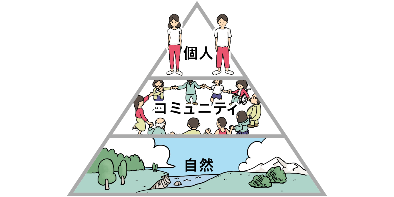 おっしゃる通り、この辺りが一番大事になってくると思います。私は一番上が個人、真ん中がコミュニティ、一番下が自然というピラミッドの図を本によく入れるんですけど、さっきからお話している資本主義とか近代以降の社会というのは、ピラミッドの突端にある個人がどんどん肥大化し、その土台であるコミュニティや自然から切り離されていったということだと思うんですね。この状況を改善するには二つのベクトルが必要だと思っていて。