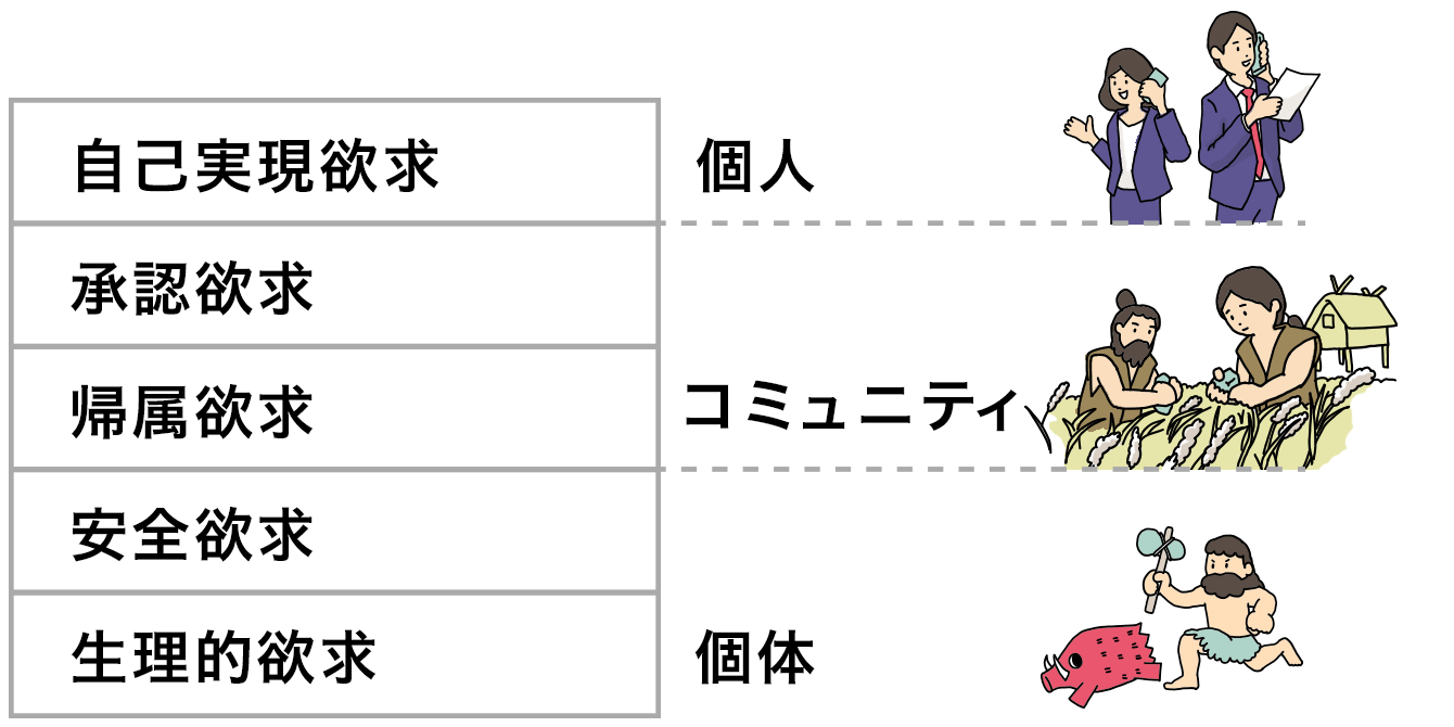そう言われて見てみるとマズローの理論は確かによくできていて、5段階の一番下が食欲などの「生理的欲求」で、2番目が「安全欲求」なんですけど、この二つは個体レベルなんですね。