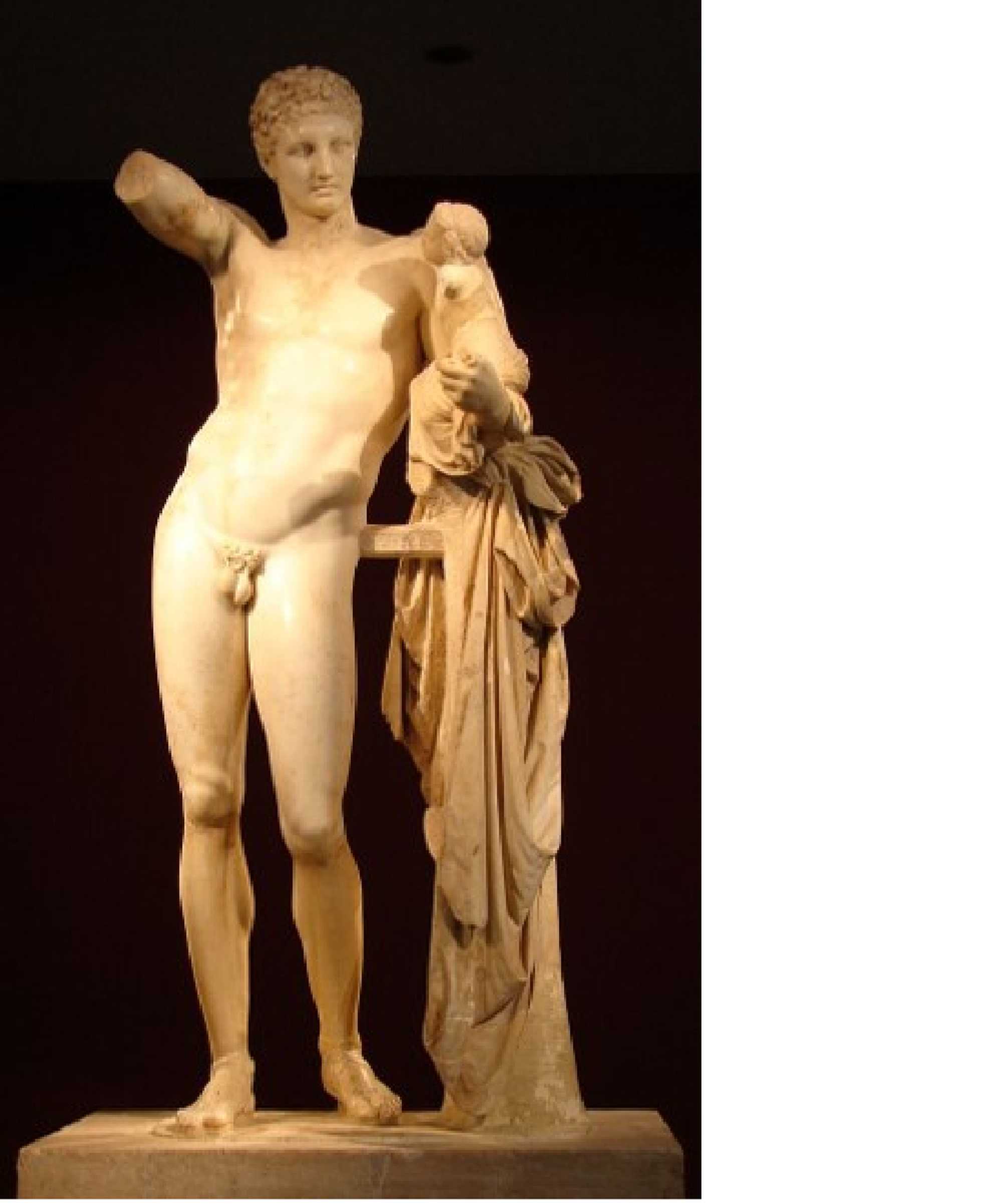 神が創造した世界や大自然を人の手で「模倣」したいと願うことや、「極めて精緻に描いた像」を見て感動することは、どちらも人間の本能に由来するということです。実際にアリストテレスの時代に、彫像では写実表現はすでに完成の域に達していました。プラクシテレスが制作したと言われている《ヘルメス》(BC.330年頃)[図1]は、男性の理想的な肉体がまるで実物のように再現されています。同時代の絵画で現存しているものはほとんどありませんが、プリニウスの『博物誌』(77-79年頃)には、画家アペレス(BC.330年頃に活動)がモデルの特徴を実に正確に捉えた絵を描いたことが記されています。