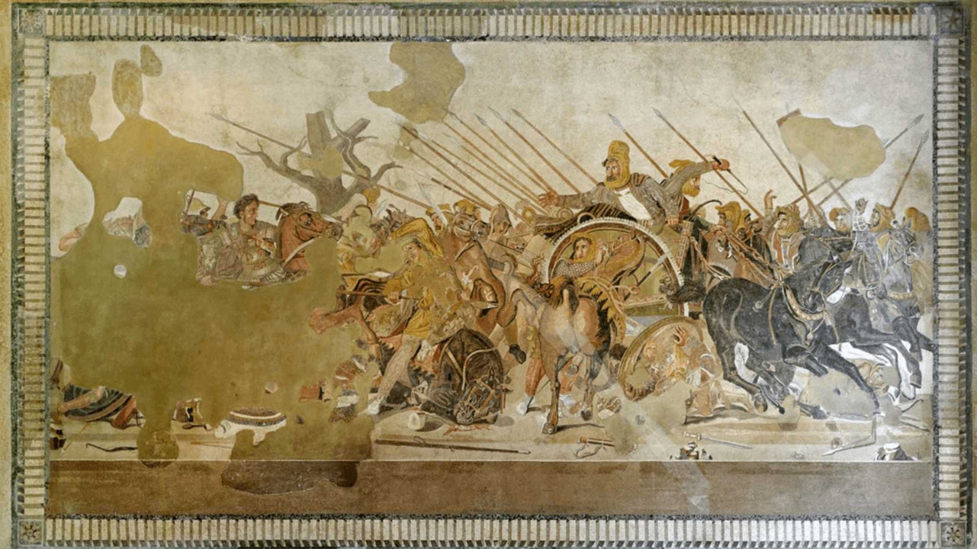 またローマ時代のコピーではありますが、ポンペイの「ファウヌスの館」の中庭に設置されていた《イッソスの戦い》[図2]は、この戦争が実際に起きた紀元前333年からそう遠くない時期に、この床モザイクの原作が描かれていたと考えられています。