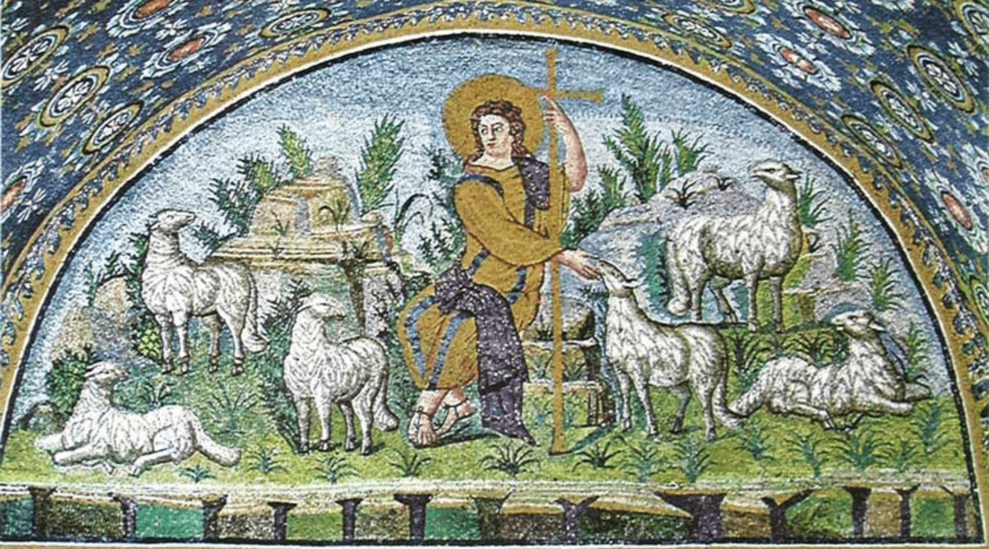 まずガッラ・プラチーディア廟堂のキリスト像(423-450年頃)[図3]ですが、体をややひねりながらしっかりと岩に腰かけています。脚を交差させ両腕を上下に配すポーズは、人間らしい動きを感じさせます。周囲の羊の配置や大きさも自然であり、大地も手前から後方に向けて奥行きを感じさせ、上方には青い空が広がっています。