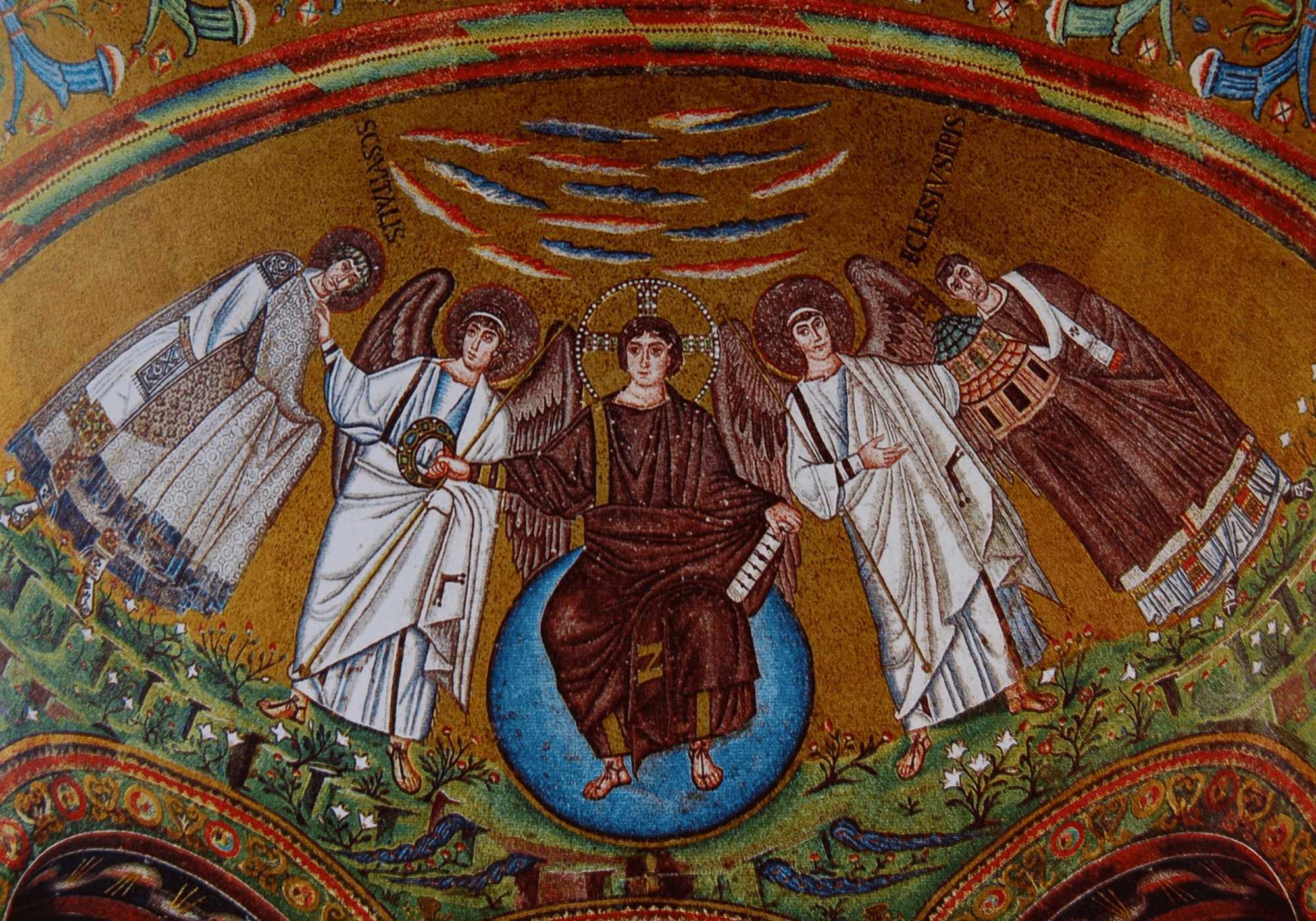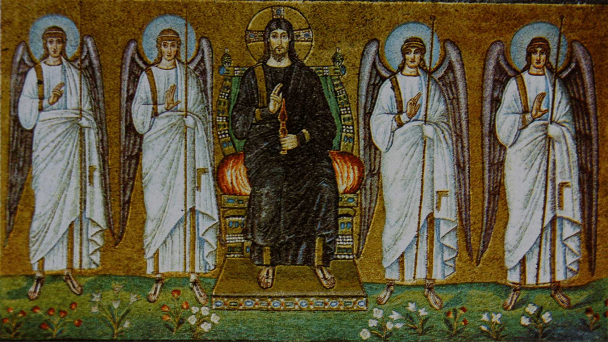 一方、その100年ほど後に制作されたサン・ヴィターレ聖堂のキリスト像(547年頃)[図4]は、青い天球とともに宙に浮遊しているようです。そのポーズはほぼ左右対称で正面性の強いものとなっており、大きく見開いた目によって鑑賞者を威圧しているようです。周囲の聖人や天使はほぼ同じ大きさで横一列に並んでおり、空間の奥行はあまり感じられません。さらに背景はほとんどが金で埋め尽くされているため、そこに現実の世界が表されているようにはまったく見えないのです。