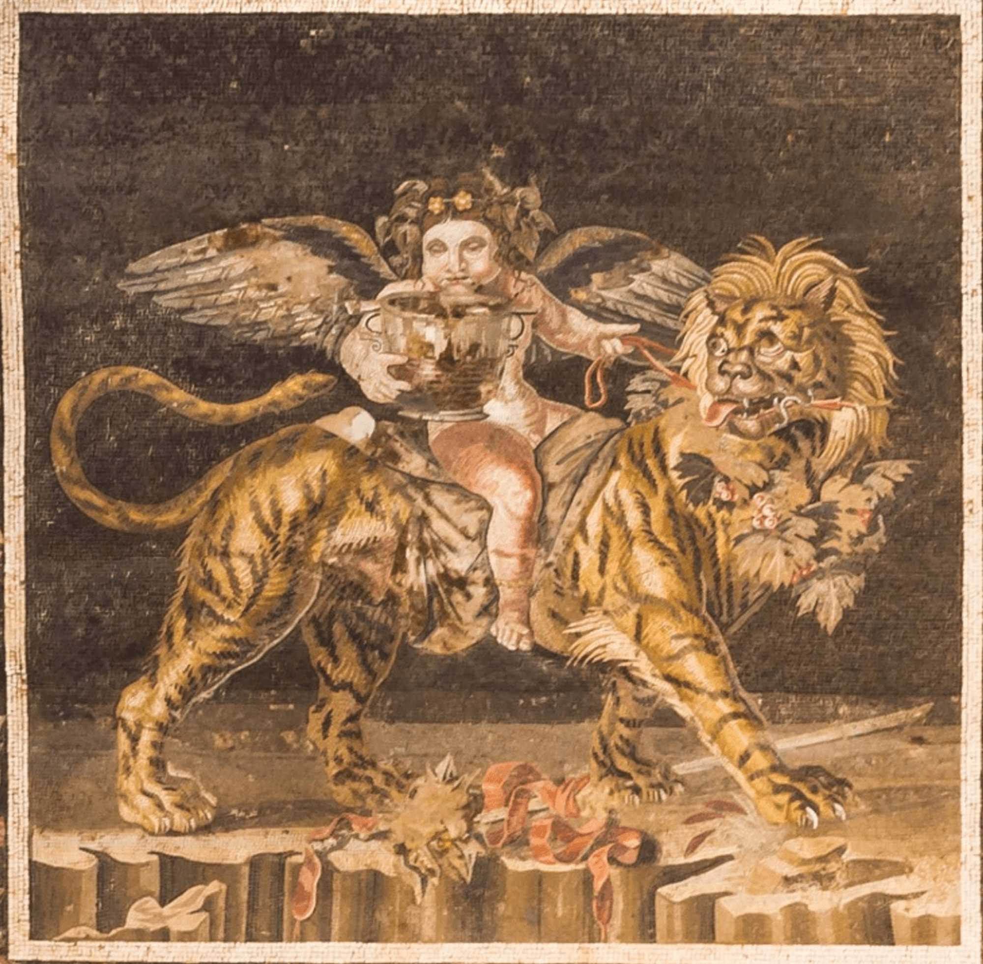 紀元前4世紀末の原作をローマ時代にコピーしたモザイク、《獅子に跨る少年バッコス》[図5]を見ると、ガッラ・プラチーディア廟堂の《善き羊飼いとしてのキリスト》[図3]よりもはるかに写実的であることがわかります。ここに表されたバッコスのような古代の神々は、自然や人間の延長線上に置かれていました。例えばゼウス(ユピテル)は「天空」「父性」、アフロディーテ(ウェヌス)は「愛」「美」、ディオニュソス(バッコス)は「豊饒」「神秘性」の象徴だったのです。そのため古代の芸術家は神々を美しい肉体を持つ人間として、そしてその周囲の空間を現実世界のように表現していたのです。