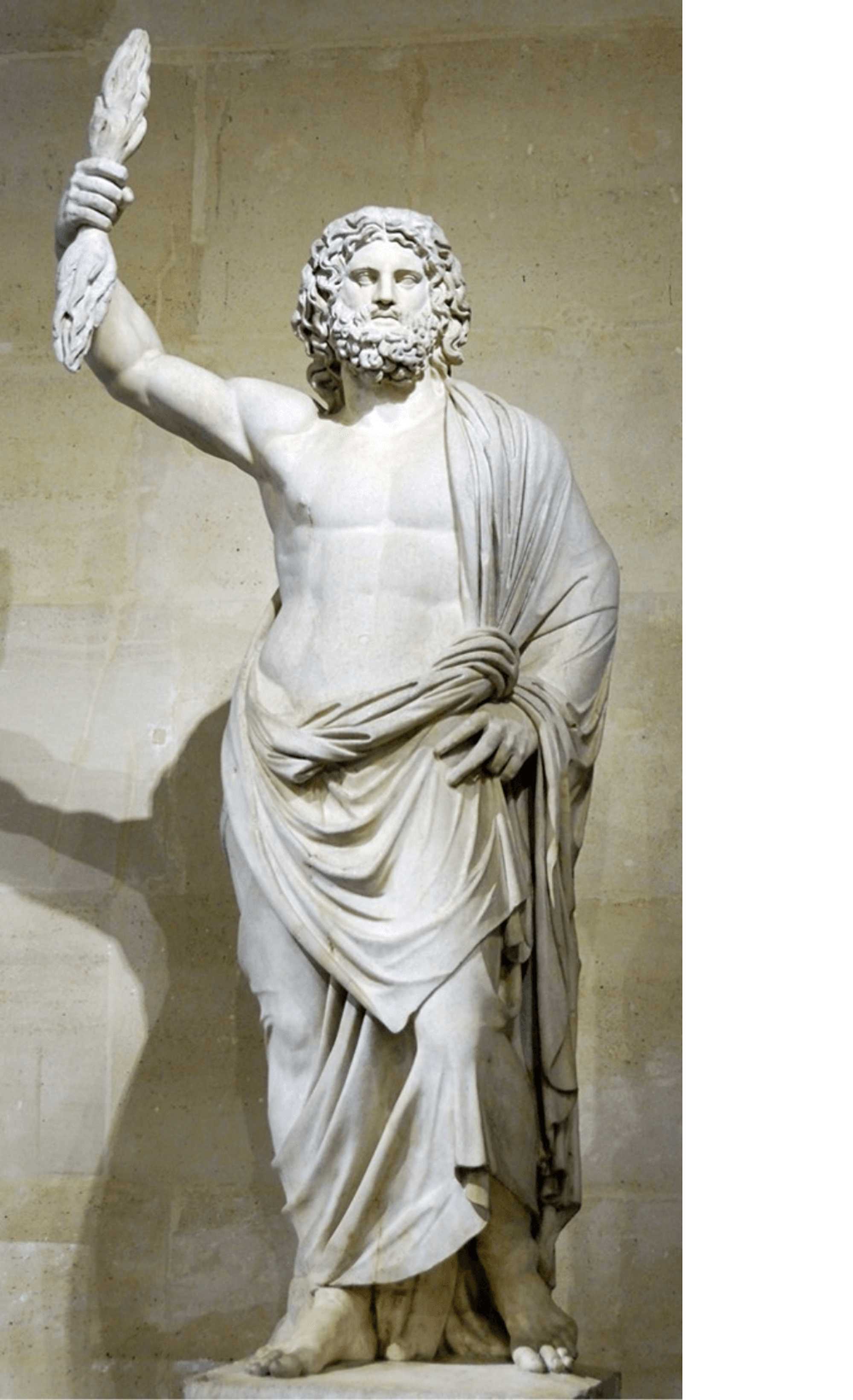 5世紀末に建てられたラヴェンナのサンタポリナーレ・ヌオーヴォ聖堂には、身廊(聖堂入口から祭壇へと続くスペース)の上層部にモザイクが施されているのですが、右側壁のもっとも祭壇側に《玉座のキリスト》[図6]が表されています。このモザイクはサン・ヴィターレ聖堂の《楽園のキリスト》[図4]よりもやや後の560年頃に制作されたものですが、そのキリストの姿は現代にまで継承されているなじみのあるものです。彼のこうした容貌は古代ローマで信仰されていた天空の神ユピテル[図7]をモデルにして創出されたと考えられています。私たちがよく知っているイエスの顔は、実はキリスト教からすれば異教の神から借用して創出されたものなのです。