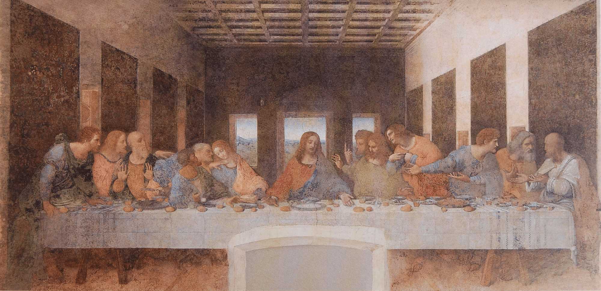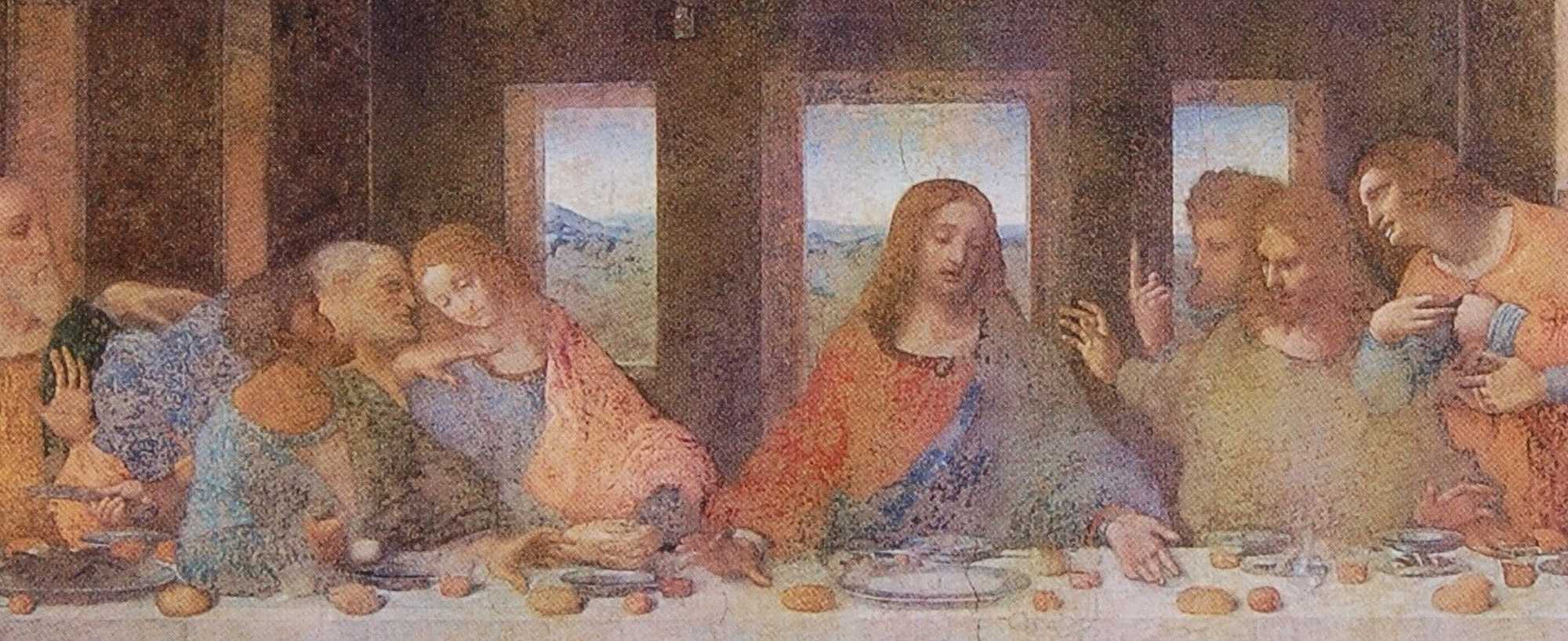 ミラノのサンタ・マリア・デッレ・グラーツィエ聖堂付属修道院内にある食堂の奥壁に描かれたこの壁画では、人物像がほぼ等身大で表されています。中央のイエスは左手でパンを示しながら右手はワインの入ったグラスへと伸ばしていますが、グラスの隣にある鉢へ向けているようにも見えます。その同じ鉢に手を差し出している者こそ、『マタイ福音書』(26章23)に記されているように、裏切り者のユダなのです。