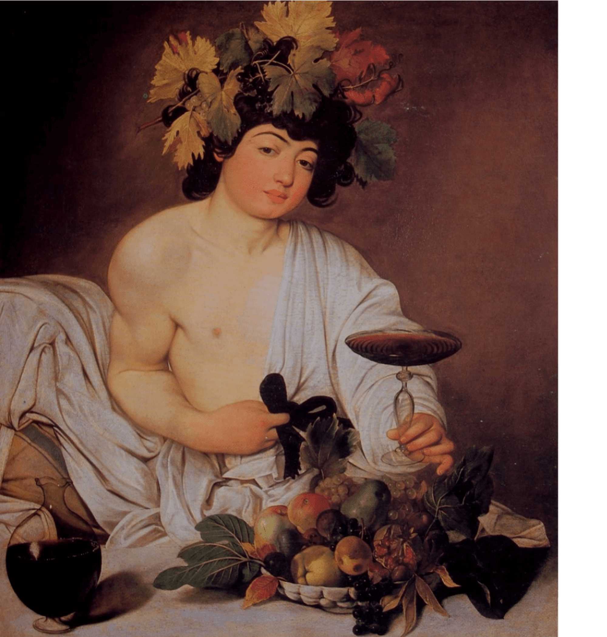 カラヴァッジョがローマに来て約3年後に描いた《バッコス》[図2]は、当時、同居していた友人マリオ・ミンニーティをモデルにしているとされますが、ぶどうの蔦からなる冠や、果物籠、ワインといったモティーフを添えることで、彼を「豊饒と酒の神」に仕立て上げています。