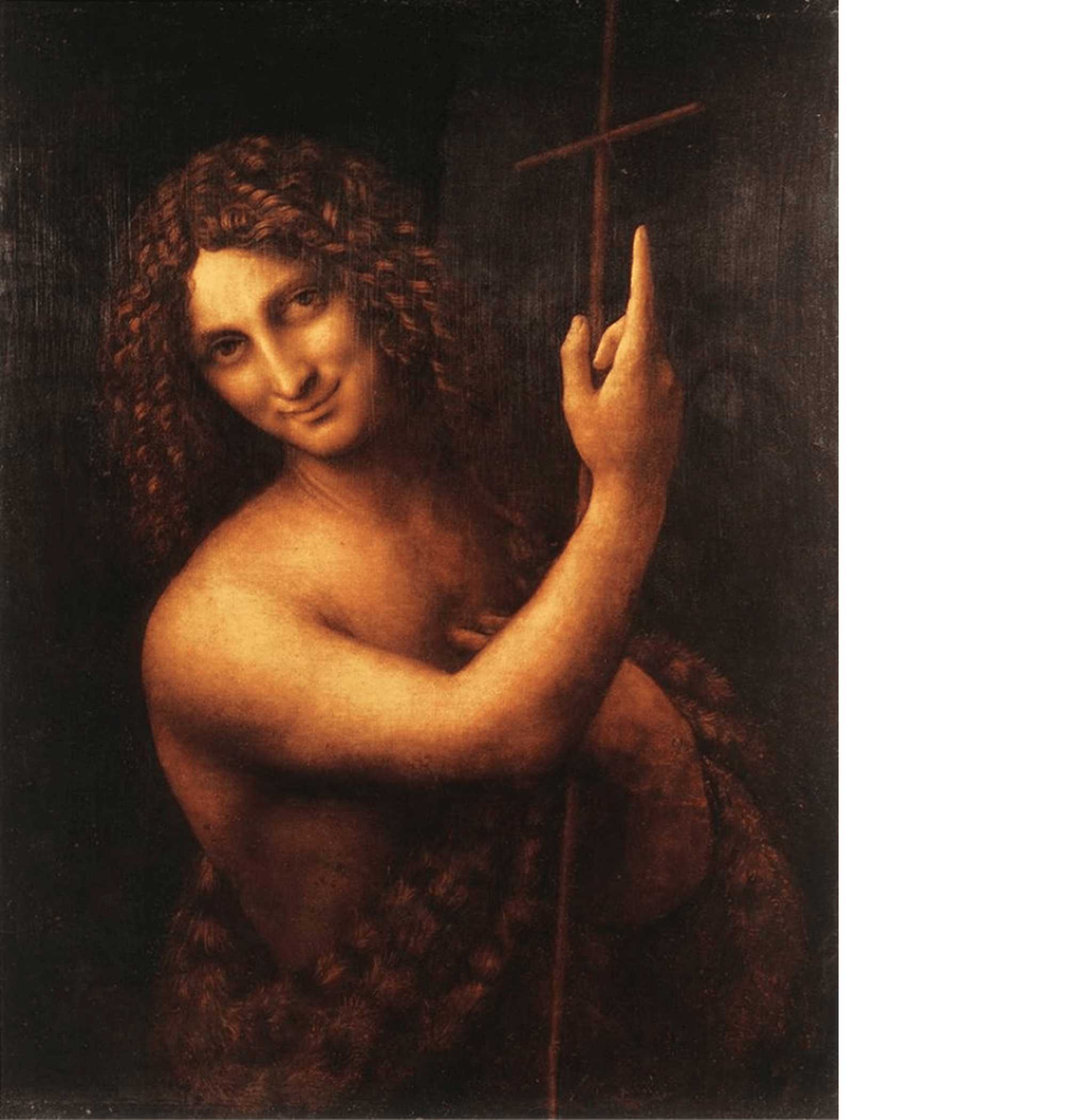 この作品と共通点を持つのが、80年程前にレオナルドによって描かれた《洗礼者ヨハネ》[図3]です。モデルはレオナルドが寵愛していた弟子のサライと言われているのですが、天を指し示すポーズ、ラクダの毛皮、十字型の杖により、彼は突然、イエスに洗礼を施したヨハネへと変身しています。