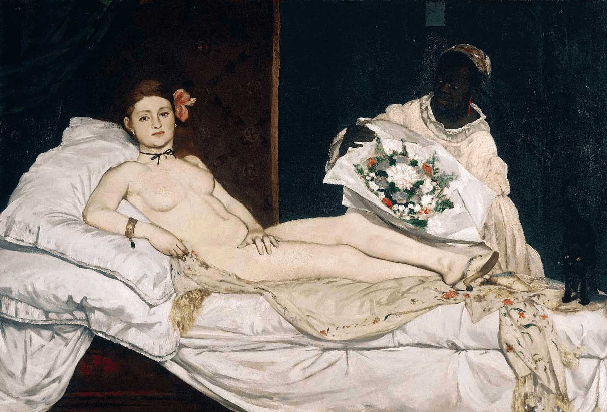 マネの《オランピア》はこのような社会状況から生み出されました。裸婦の肌、クッションやシーツ、裸婦が持つ花柄の生地、召使いのまとっている服、花とそれを包む紙はいずれも白を基調としていますが、その色調と質感は微妙に異なります。同様に召使いの肌、猫、背後の壁やカーテンは暗褐色を見事に描き分けているのです。こうしたデリケートな差異を示すことにより、マネは写真では不可能なことを表現しようとしているのかもしれません。