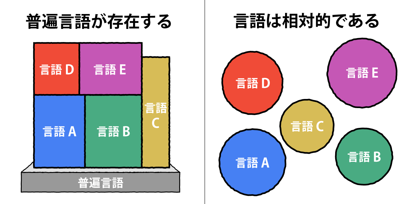 言語に対する考え方を大ざっぱに分けると、こういう論理構造をバックグラウンドとした「普遍言語」が存在するんだというものと、ソシュールに代表されるように、そんなものはなく、個々の言語によってその体系はまったく異なるんだという考え方、これを言語相対主義というんですけど、大きくこの二つですね。その中間にいろんなバリエーションがあるという感じです。