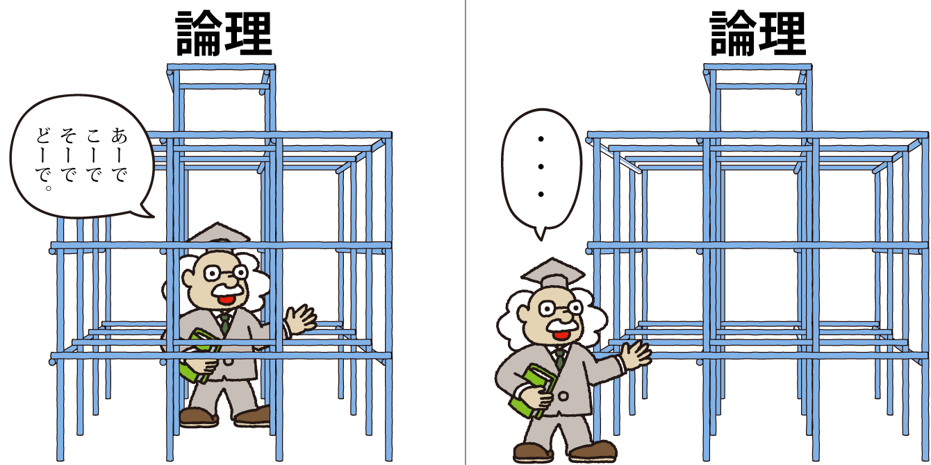 我々はふつう論理に基づいてしゃべってますよね。自分が基づいてしゃべっているこの論理がどういうものかをチェックするには、論理の外側に立たなきゃいけない。でも、論理の外側に立ったらわれわれは論理じゃなくなってしまうわけだから、本来は立つことができない。